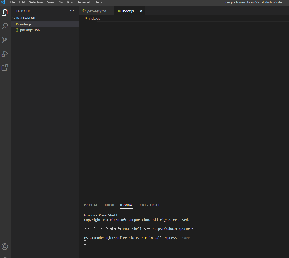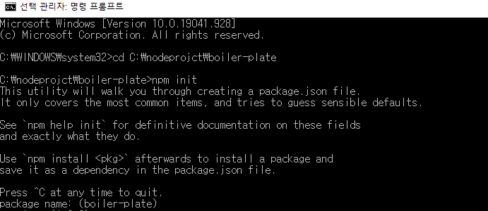 2.나는 C드라이브에 boiler-plate라는 폴더를 만들었다. 이곳에 노드js 프로젝트를 만들계획.