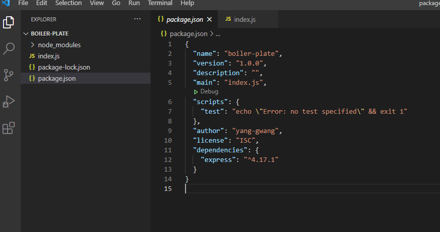 { "name": "boiler-plate", "version": "1.0.0", "description": "", "main": "index.js", "scripts": { "start": "node index.js", "test": "echo \"Error: no test specified\" && exit 1" }, "author": "yang-gwang", "license": "ISC", "dependencies": { "express": "^4.17.1" } }pakage.json에 추가