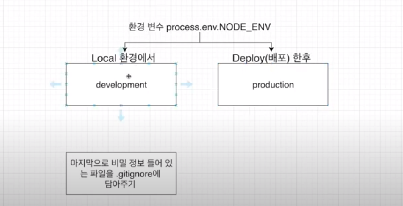 if(process.env_NODE_ENV ==='production'){ module.exports = require('./prod'); } else{ module.exports = require('./dev'); }local 환경이면 process.env_NODE_ENV가 development로 나오고 배포한 후라면 production이 나와서 그에 따른 config파일을 가져온다.