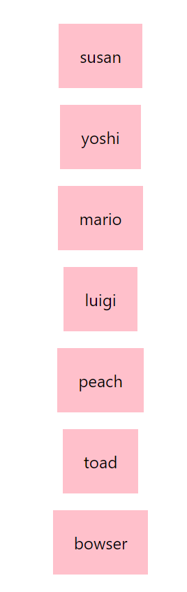 //App.js import { StatusBar } from 'expo-status-bar'; import React, { useState } from 'react'; import { StyleSheet, Text, View, Button, TextInput } from 'react-native'; export default function App() { const [people, setPeople ] = useState([ {name: "susan", key:'1' }, {name: "yoshi", key:'2' }, {name: "mario", key:'3' }, {name: "luigi", key:'4' }, {name: "peach", key:'5' }, {name: "toad", key:'6' }, {name: "bowser", key:'7' }, ]) return ( <View style={styles.container}> {people.map( (index) => { return ( <View key={index.key}> <Text style={styles.item}>{index.name}</Text> </View> ) })} </View> ); } const styles = StyleSheet.create({ container: { flex: 1, backgroundColor: '#fff', alignItems: 'center', justifyContent: 'center', }, item:{ marginTop : 24, padding : 30, backgroundColor : 'pink', fontSize : 24 } });map함수를 사용해서 데이터 뿌려주는건 react랑 같다. map함수를 사용할때 항상 key값을 넣어줘야하는거 잊지 말자.