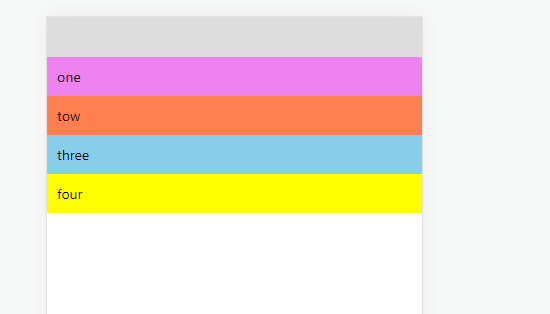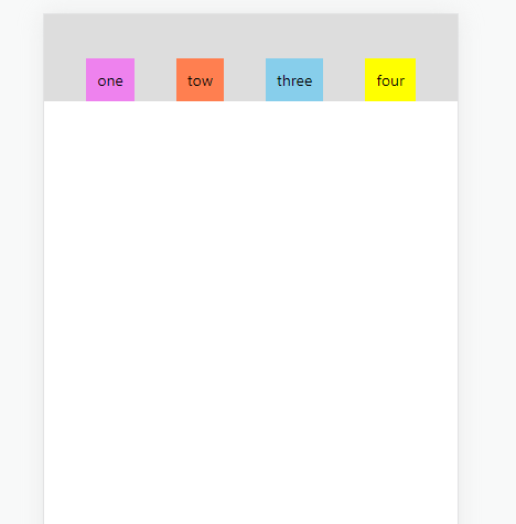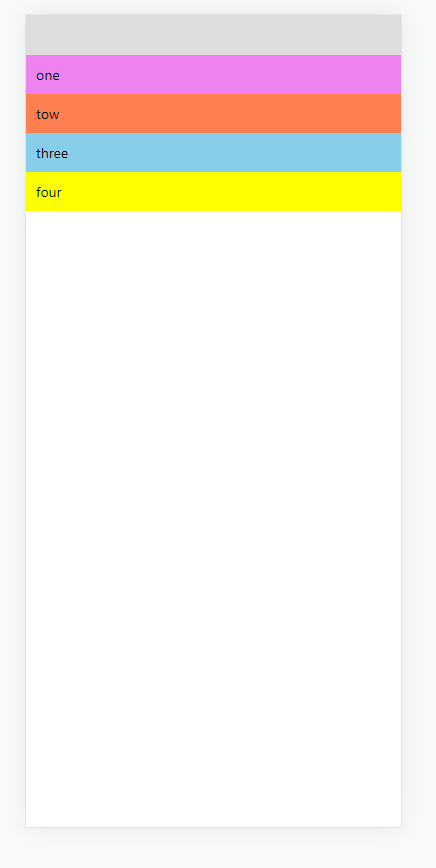 //Components/Sandbox.jsx import React from 'react' import { StyleSheet, View, Text, TouchableOpacity } from 'react-native'; export default function Sandbox() { return ( <View style={styles.container}> <Text style={styles.BoxOne}>one</Text> <Text style={styles.BoxTwo}>tow</Text> <Text style={styles.BoxThree}>three</Text> <Text style={styles.BoxFour}>four</Text> </View> ) } const styles = StyleSheet.create({ container: { flext: 1, paddingTop: 40, backgroundColor: '#ddd' }, BoxOne : { backgroundColor: 'violet', padding: 10 }, BoxTwo : { backgroundColor: 'coral', padding: 10 }, BoxThree : { backgroundColor: 'skyblue', padding: 10 }, BoxFour : { backgroundColor: 'yellow', padding: 10 }, });//App.js /* 플랙스 박스 */ import Sandbox from './Components/Sandbox'; return ( <Sandbox></Sandbox> // <TouchableWithoutFeedback onPress= { () => { // Keyboard.dismiss(); // }}> // <View style={styles.container}> // <Header></Header> // <View style={styles.contents}> // <AddTodo SubmitHandler={SubmitHandler}></AddTodo> // <Contents todos={todos} setTodos={setTodos}></Contents> // </View> // </View> // </TouchableWithoutFeedback> );결과화면)