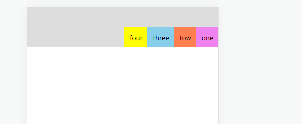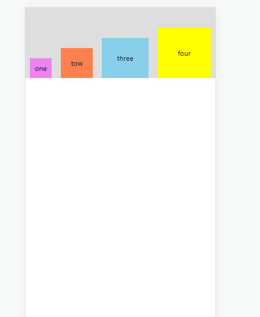 container: { flext: 1, flexDirection:'row', justifyContent:'space-around', alignItems:'flex-end', paddingTop: 40, backgroundColor: '#ddd' }, BoxOne : { backgroundColor: 'violet', padding: 10 }, BoxTwo : { backgroundColor: 'coral', padding: 20 }, BoxThree : { backgroundColor: 'skyblue', padding: 30 }, BoxFour : { backgroundColor: 'yellow', padding: 40 },