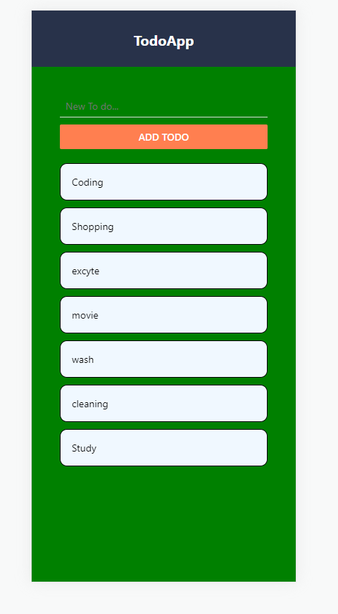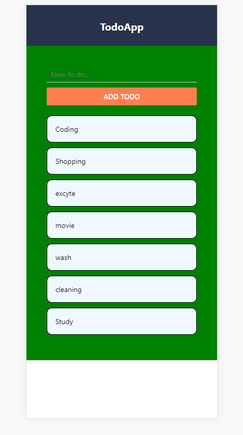 //App.js //위 내용 생략 return ( // <Sandbox></Sandbox> <TouchableWithoutFeedback onPress= { () => { Keyboard.dismiss(); }}> <View style={styles.container}> <Header></Header> <View style={styles.contents}> <AddTodo SubmitHandler={SubmitHandler}></AddTodo> <Contents todos={todos} setTodos={setTodos}></Contents> </View> </View> </TouchableWithoutFeedback> ); const styles = StyleSheet.create({ container: { flex: 1, backgroundColor: '#ffff', }, contents : { padding: 40, backgroundColor: 'green', } });결과)