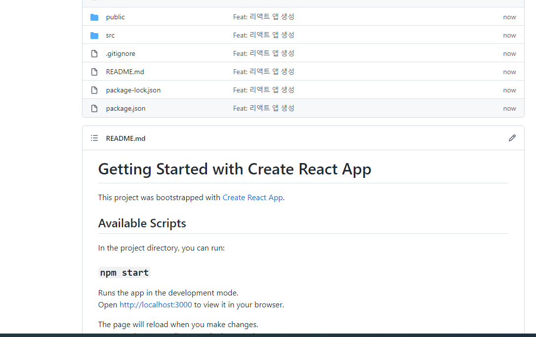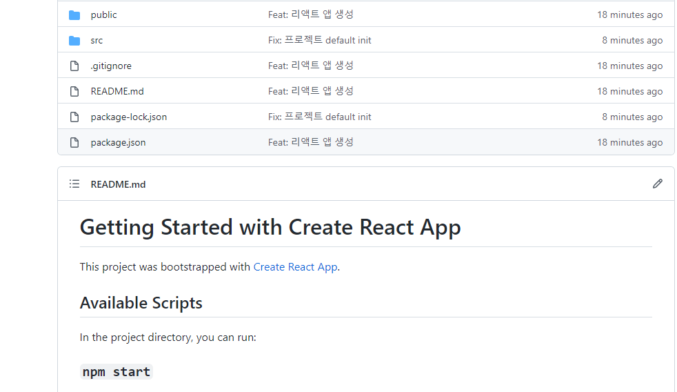 //App.js import React from "react"; function App() { return ( <div> 홈 </div> ); } export default App;git add . git commit -m "Fix: 프로젝트 default init" git push -u origin main//github에서 확인
