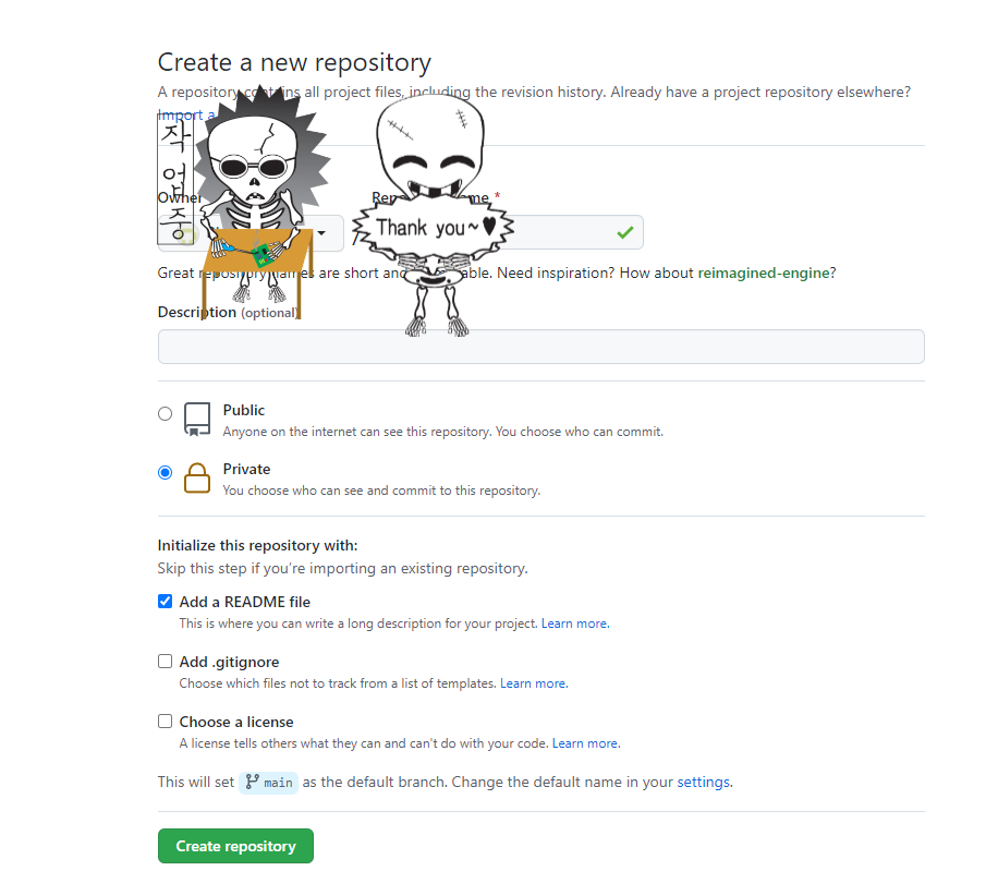 [1] 회사에서 하는 프로젝트이므로, private로 만들고, Add a README file을 추가한다.
