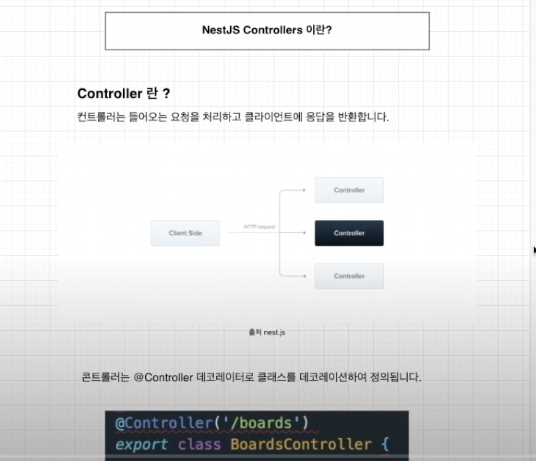 nest g controller boards --no-spec # nest : using nest-cli # g : generate # controller : controller schematic # boards : name of the schematic # --no-spec : 테스트를 위한 소스코드 생성x