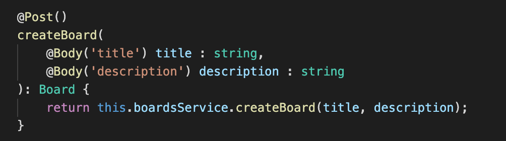 //controller import { Body, Controller, Get, Post } from '@nestjs/common'; import { Board } from './board.model'; import { BoardsService } from './boards.service'; @Controller('boards') export class BoardsController { constructor(private boardsService : BoardsService){} @Get('/') getAllBoard(): Board[] { return this.boardsService.getAllBoards(); } @Post() createBoard( @Body('title') title : string, @Body('description') description : string ): Board { return this.boardsService.createBoard(title, description); } }NestJS에서는 @Body body를 이용해서 가져옵니다.