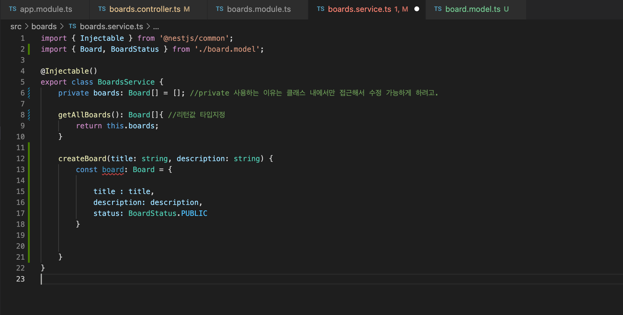 //service import { Injectable } from '@nestjs/common'; import { Board, BoardStatus } from './board.model'; @Injectable() export class BoardsService { private boards: Board[] = []; //private 사용하는 이유는 클래스 내에서만 접근해서 수정 가능하게 하려고. getAllBoards(): Board[]{ //리턴값 타입지정 return this.boards; } createBoard(title: string, description: string) { const board: Board = { title : title, description: description, status: BoardStatus.PUBLIC } } }