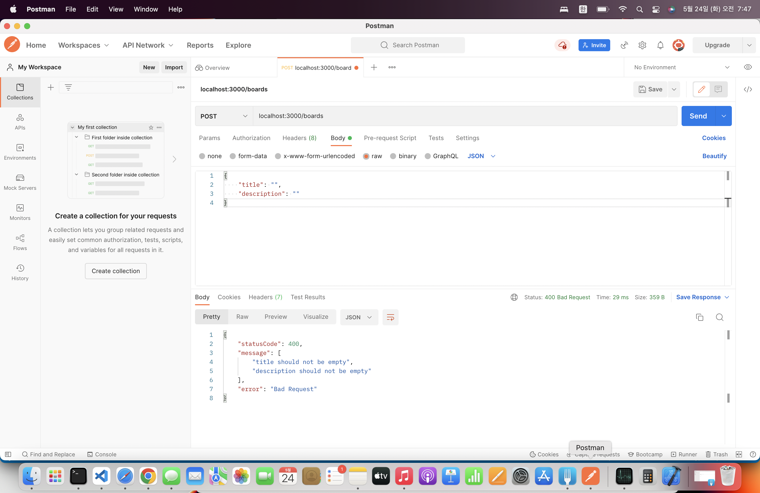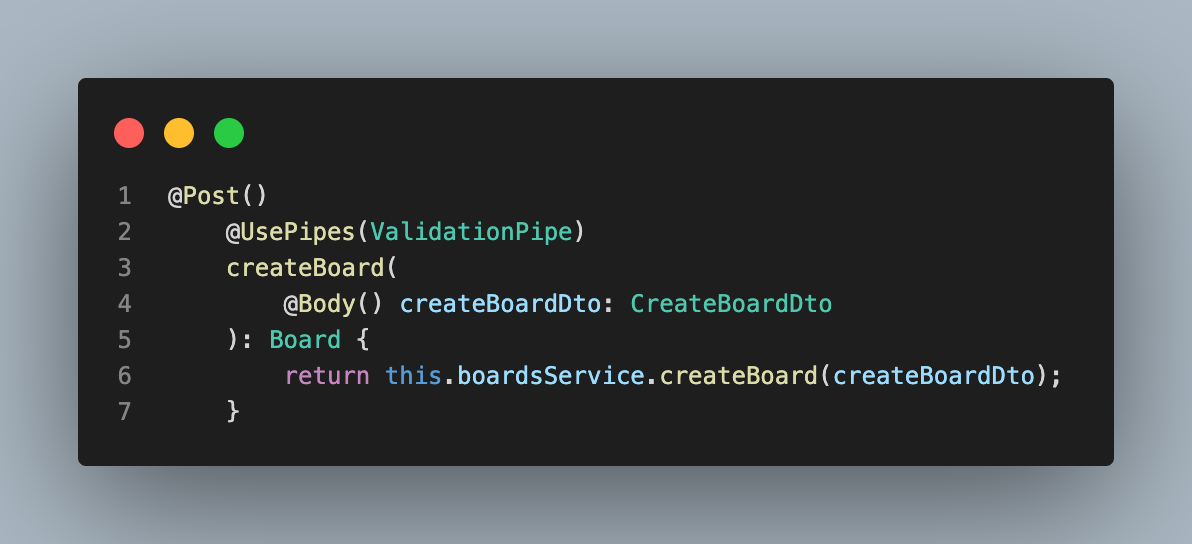 - Handler-level Pipes를 사용하여 ValidationPipe 값 확인 하는 파이프 CreateBoardDto에 추가 되어 있는 IsNotEmpty를 통해 값이 있는지 체크