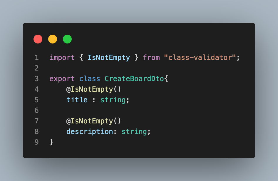 npm install class-validator class-transformer --saveDocumentation 페이지 - https://github.com/typestack/class-validator#manual-validation