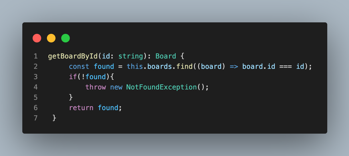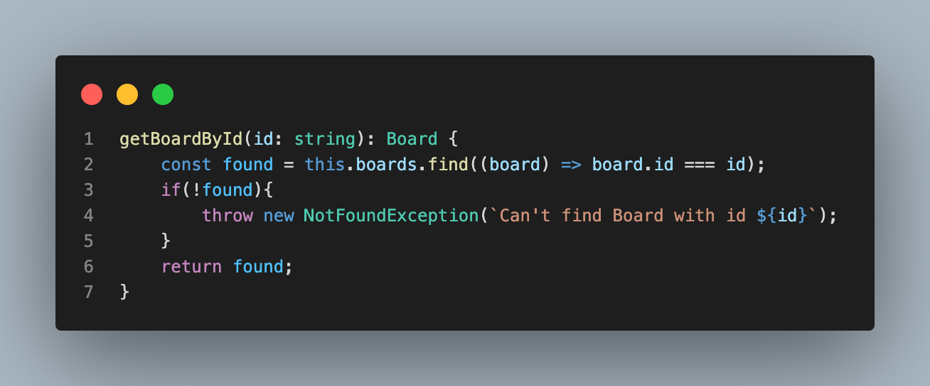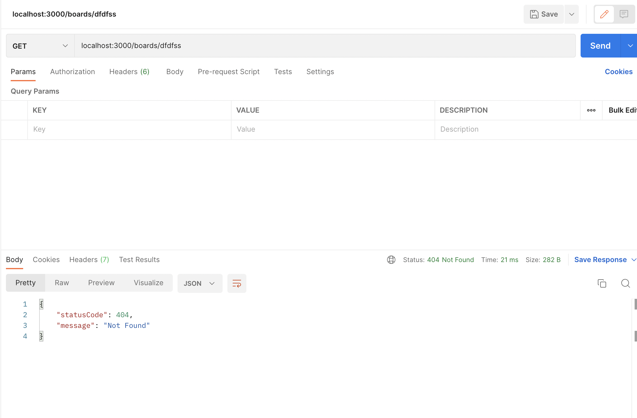 import { Injectable, NotFoundException } from '@nestjs/common';NotFoundException함수는 nest.js의 기본 내장 예외 인스턴스이고, 에러 메세지를 보여준다.
