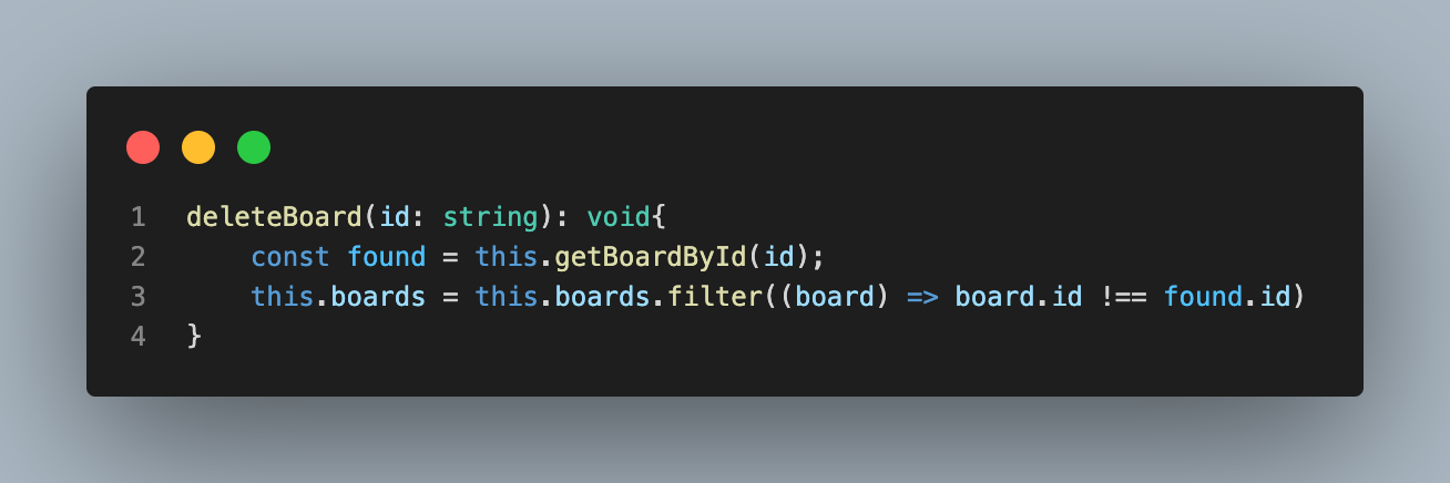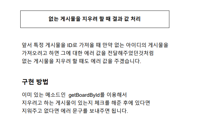 이전에 getBoardById함수에 에러처리를 했기 때문에 게시물 삭제 요청이 들어 왔을때 없으면 에러가 날것이고, 존재 할 경우 삭제.