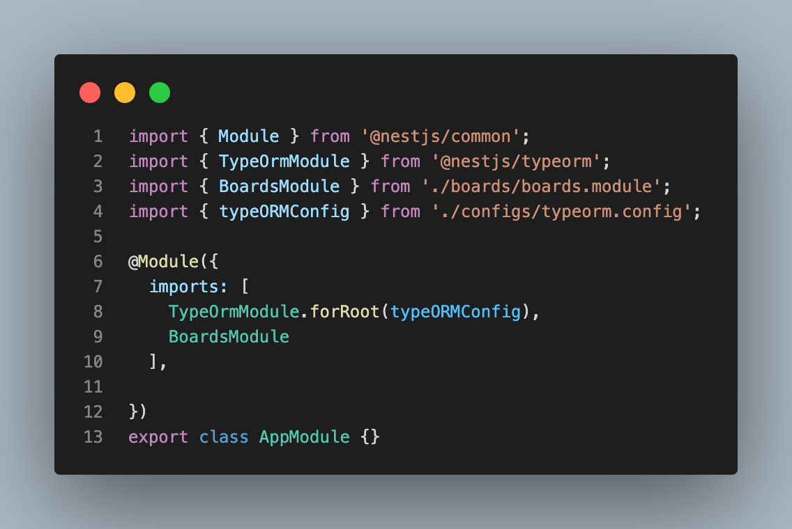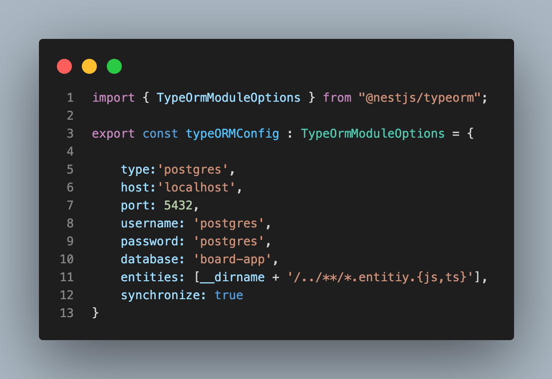 2. synchronize : true 값을 주면 애플리케이션을 다시 실행할 때 엔티티안에서 수정된 컬럼의 길이 타입 변경값등을 해당 테이블을 Drop한 후 다시 생성해줍니다.3. 루트 Module에서 Import 합니다.