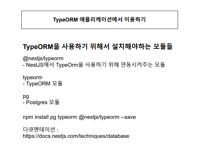 npm install pg typeorm @nestjs/typeorm --save3가지 모듈을 설치