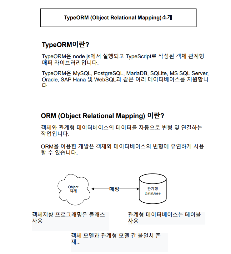 - TypeORM은 간단한 코딩으로 ORM 프레임 워크를 사용하기 쉽습니다.
