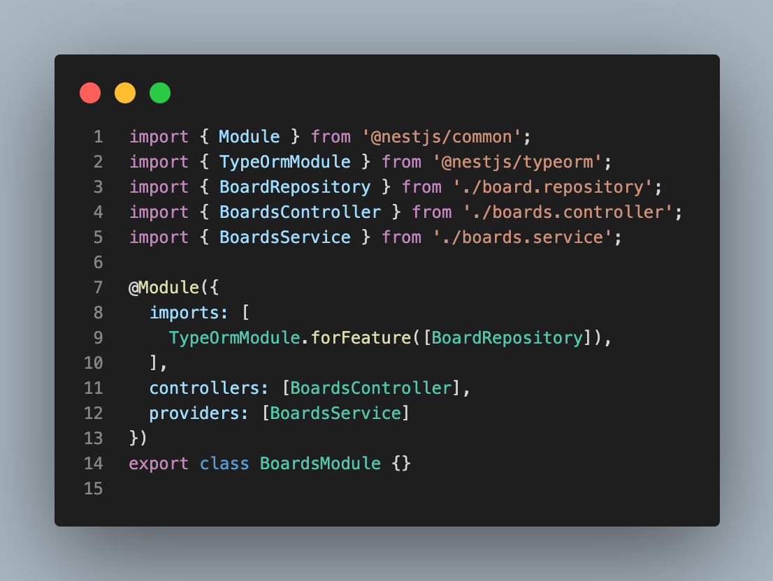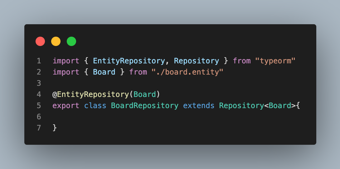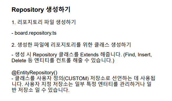 @EntityRepository 엔티티저장소 선언- 생성한 Repository를 다른곳에서도 사용할 수 있기 위해서 board.module에서 import 해준다.