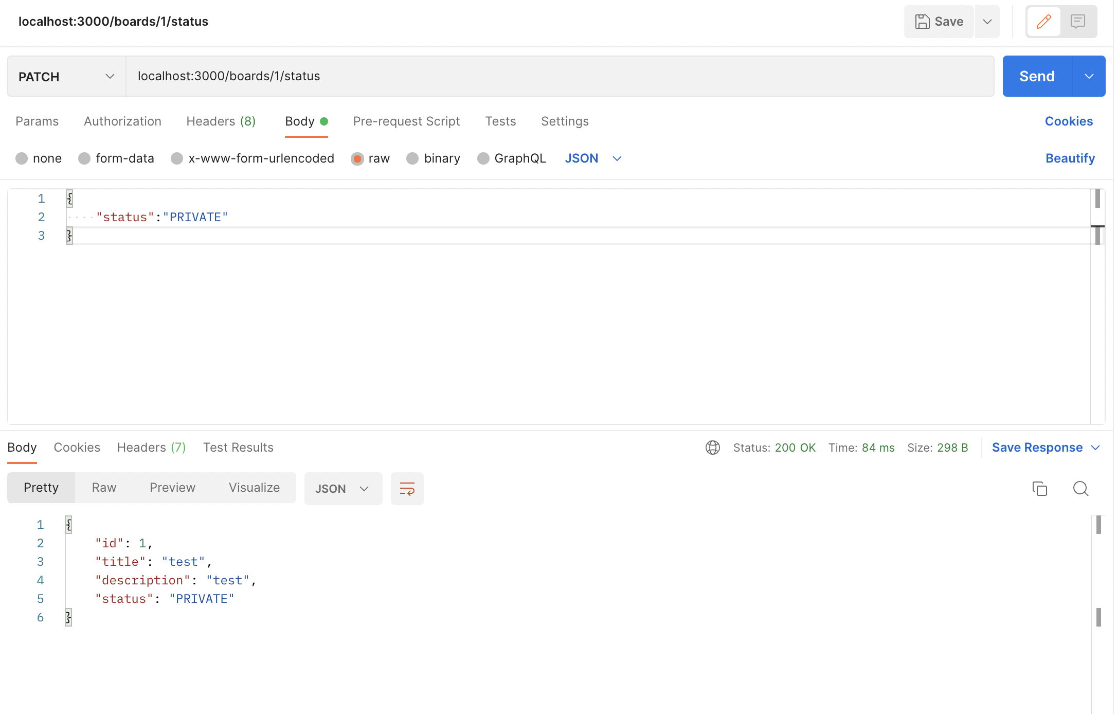 id 1값을 postman을 이용하여 status를 PUBLIC에서 PRIVATE로 변경합니다.