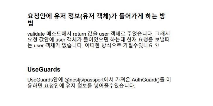 authguard를 넣어주면 req안에 JwtStrategy클래스에서 validate메소드에서 리턴값 user의 객체가 req에 들어가게 해줍니다.
