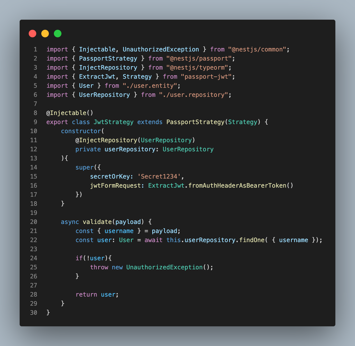 1. @Injectable() : Injectable 데코레이터 사용 이유는 JwtStrategy를 다른곳에서도 주입을 해서 사용을 할 수 있게 하기 위해서
