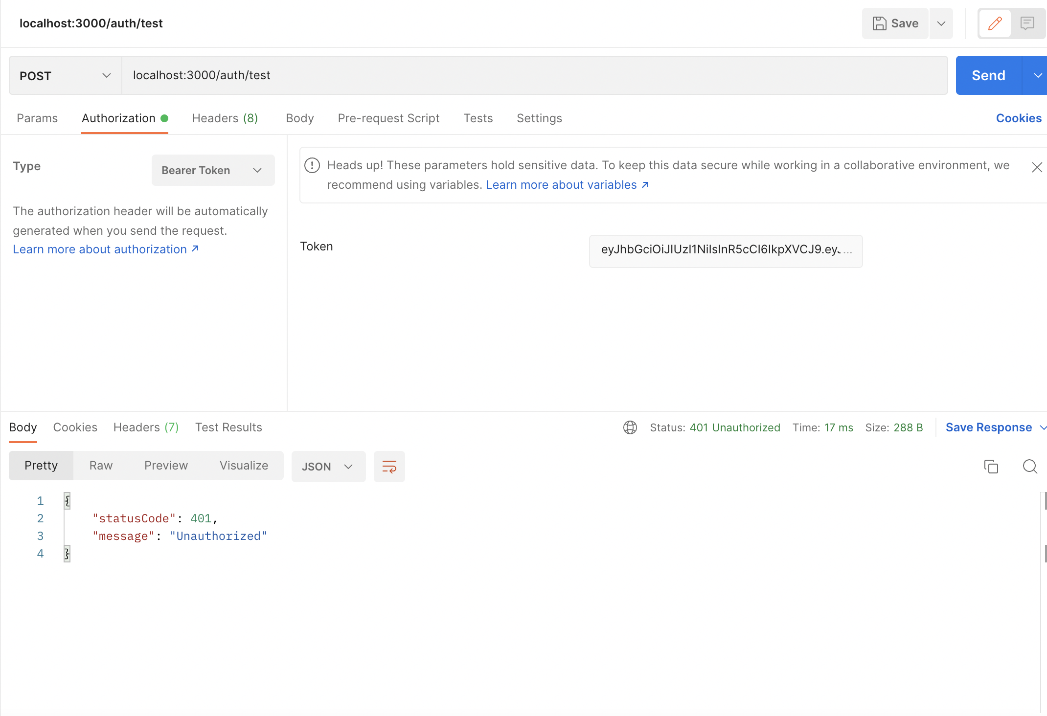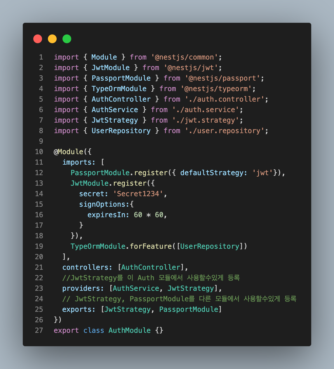 [m1 맥북] - nest.js 공부하기 34. 인증된 유저만 게시물 보고 쓸 수 있게 해주기 (0) 2022.06.12 [m1 맥북] - nest.js 공부하기 33. 커스텀 데코레이터 생성하기 (0) 2022.06.09 [m1 맥북] - nest.js 공부하기 31. JWT를 이용해서 토큰 생성하기 (0) 2022.06.04 [m1 맥북] - nest.js 공부하기 30. 로그인 기능 구현하기 (0) 2022.06.04 [m1 맥북] - nest.js 공부하기 29. 비밀번호 암호화 하기 (0) 2022.06.04