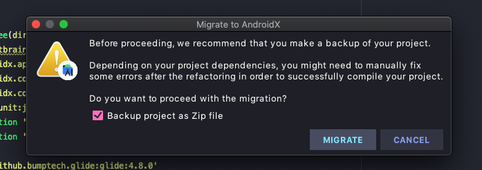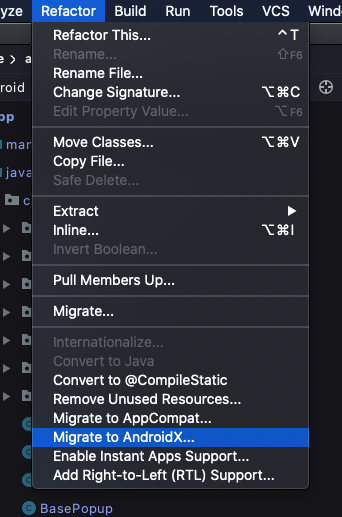 버전 28(Android Pie 이하)은 레거시 지원 라이브러리의 마지막 버전이므로 Android Q를 사용하고 앞으로는 AndroidX 라이브러리로 마이그레이션하는 것이 좋습니다. IDE에서 도움을 받을 수 있습니다. Refactor > Migrate to AndroidX ...시키는 대로 [Refactor] 메뉴에서 [Migrate to AndroidX...] 버튼을 눌러줍니다.