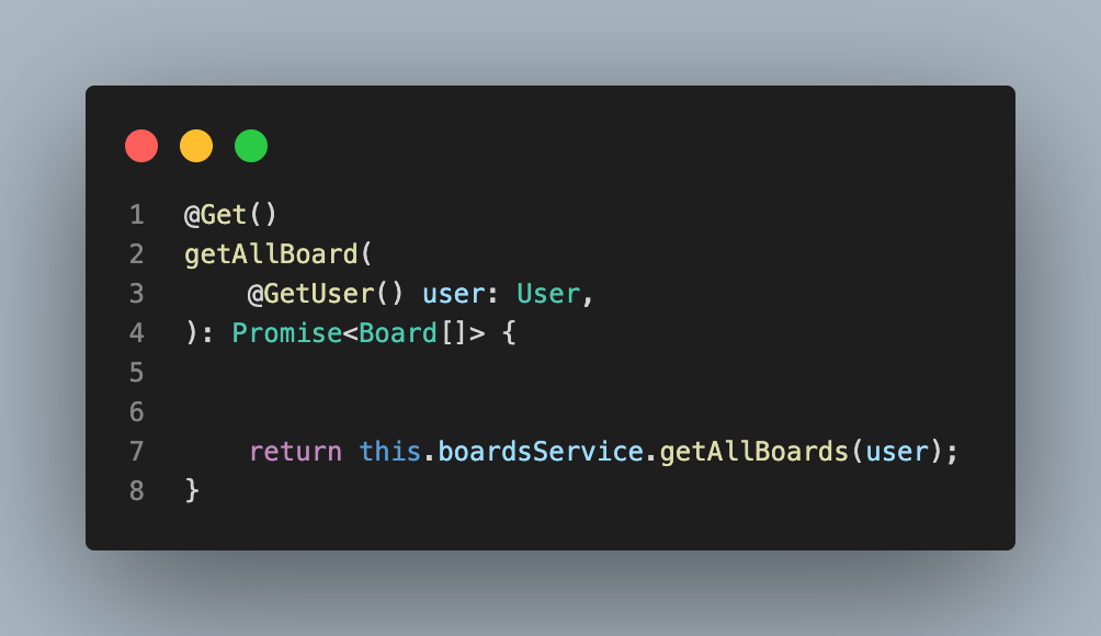 [m1 맥북] - nest.js 공부하기 39. 자신이 생성한 게시물을 삭제하기 (0) 2022.06.25 [m1 맥북] - nest.js 공부하기 38. 해당 유저의 게시물을 ID로 가져오기, 수정하기 (0) 2022.06.25 [m1 맥북] - nest.js 공부하기 36. 게시물을 생성 할 때 유저 정보 넣어주기 (0) 2022.06.12 [m1 맥북] - nest.js 공부하기 35. 인증된 유저만 게시물 보고 쓸 수 있게 해주기 (0) 2022.06.12 [m1 맥북] - nest.js 공부하기 34. 인증된 유저만 게시물 보고 쓸 수 있게 해주기 (0) 2022.06.12