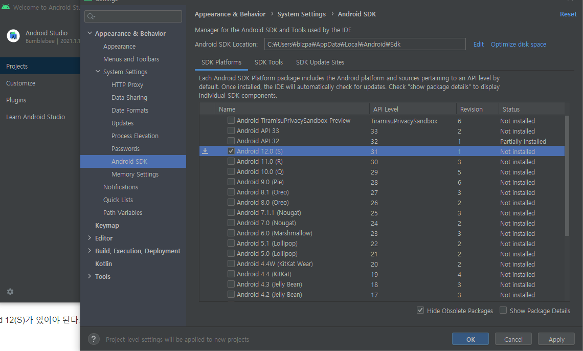 Android 12(S)가 있어야 된다고 한다 SDK 근데 내 android 스튜디오에는 안깔려 있다 그래서 에러가 나는건가?