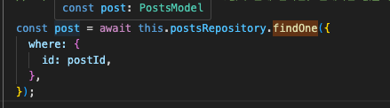 typeorm의 type 스펙과 다른 결과가 다를 수 있다.findOne(options: FindOneOptions<Entity>): Promise<Entity | null>;typeorm의 findOne 또는 findOneById등 메소드들의 type의 리턴값은 Promise<Entity | null> 이다.