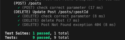 it('(GET) check correct parameter', async () => { const postServSpy = jest.spyOn(postsService, 'getPostById'); await request(app.getHttpServer()) .get(`/posts/${mockData.id}`) .expect(HttpStatus.OK); expect(postServSpy).toHaveBeenCalledWith(mockData.id); });생성된 mockData의 id값을 parameter로 전송하고 그걸 controller에서 service의 인수로 전달되니 당연히 mockData.id를 toHaveBeenCalledWith하면 정상적이다.