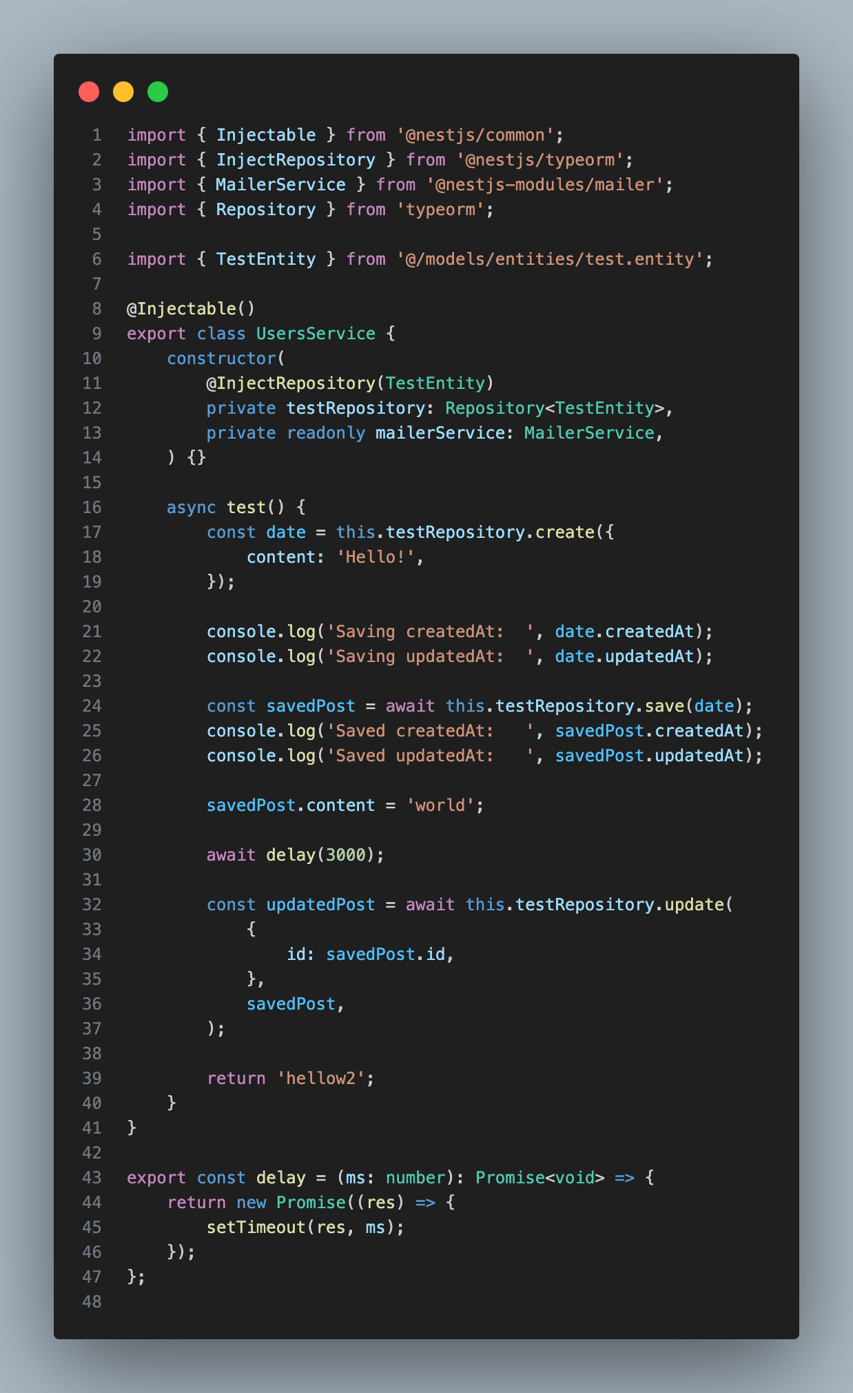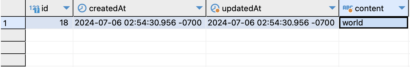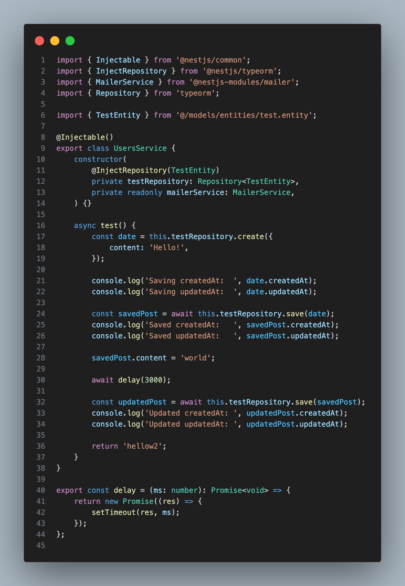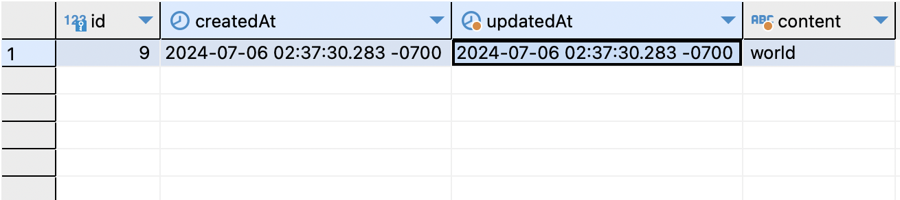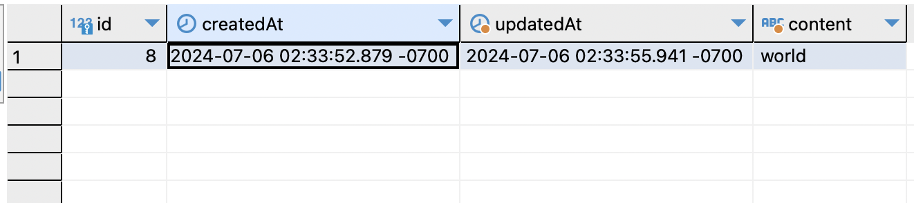 @CreateDateColumn 데코레이터와 @UpdateDateColumn 데코레이터를 사용 했을때 해당 코드는 createAt와 updatedAt 칼럼의 값이 달라진다. 대략 3초 정도 차이가 날것이다.