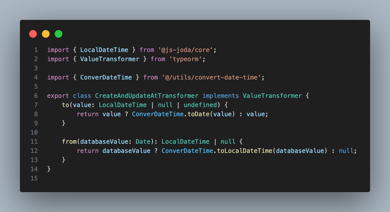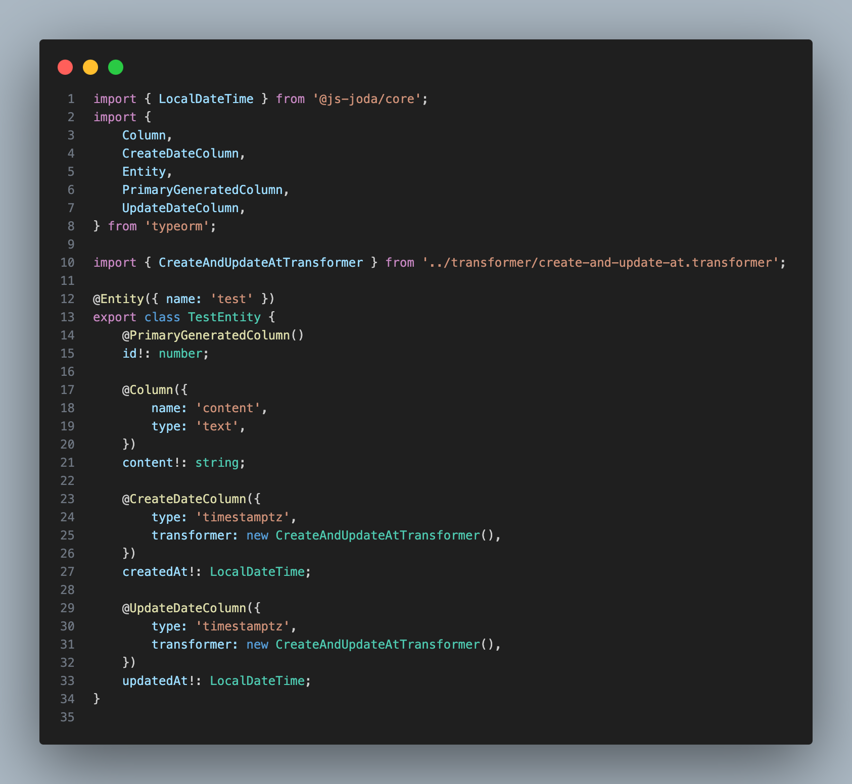무슨 말이냐면 @CreateDateColumn, @UpdateDateColumn 데코레이터 사용해서 데이터를 생성 하면 현재 date-time을 자동으로 데이터를 입력 해주는데 만약 필드에 변경이 일어날 경우에 UpdateDateColumn에서 업데이트 된 기준 일자로 다시 해당 칼럼을 업데이트 해주는데 만약에 UpdateDateColumn에 transformer 프로퍼티 옵션을 사용하게 된다면 해당 기능이 제대로 동작 하지 않는다.