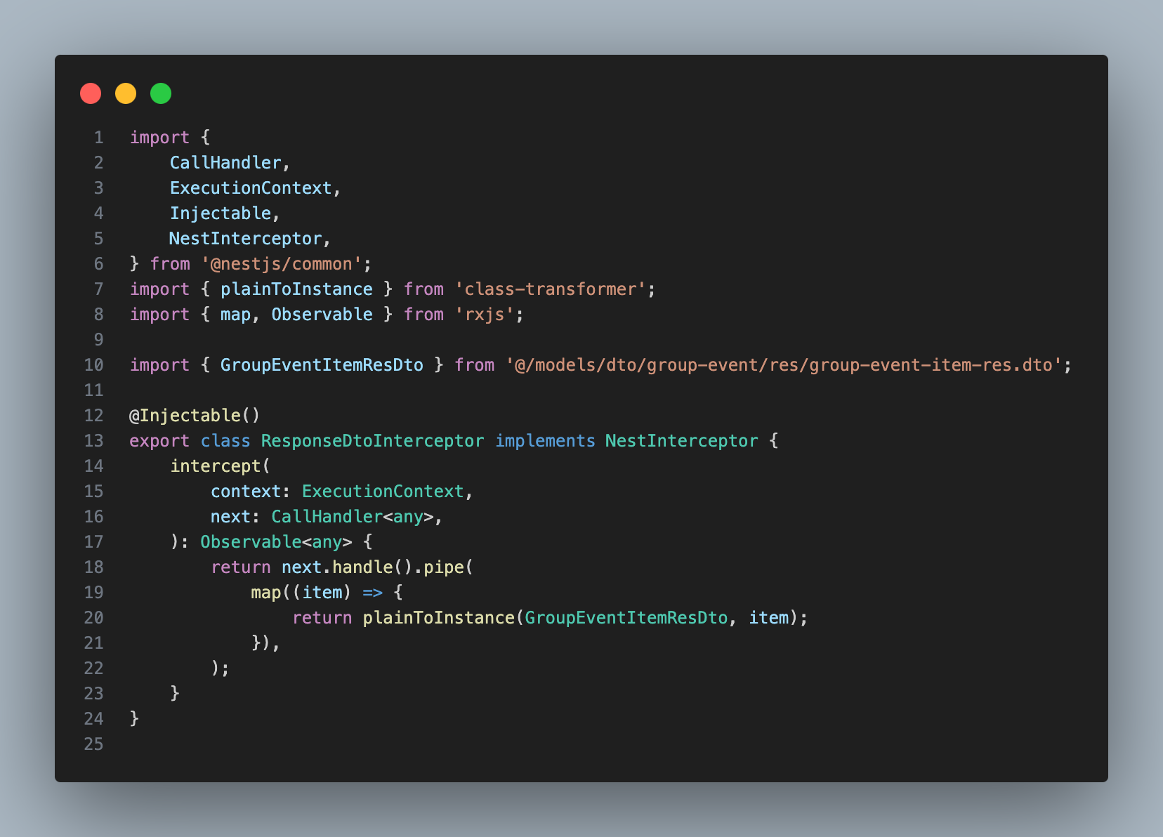 - interceptor를 app 글로벌 인터셉터로 등록 데코레이터를 통해서 특정 ResponseDto타입을 가져오기 즉, 비지니스 로직이 수행되고 마지막에 responseDto로 serialize하는 공통 관심사를 AOP interceptor를 통해 분리