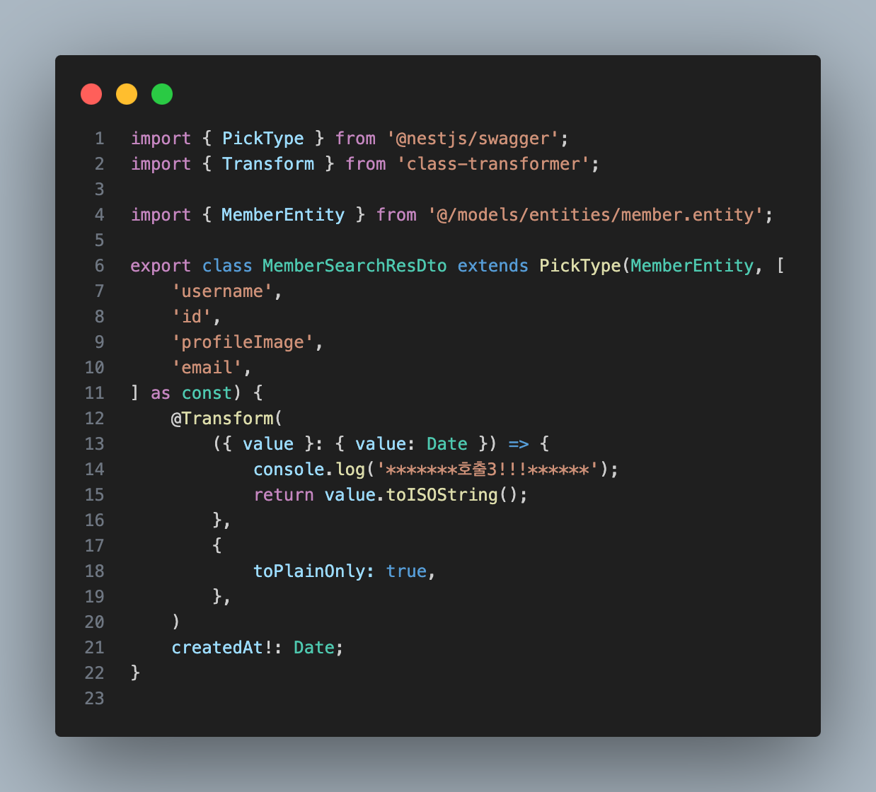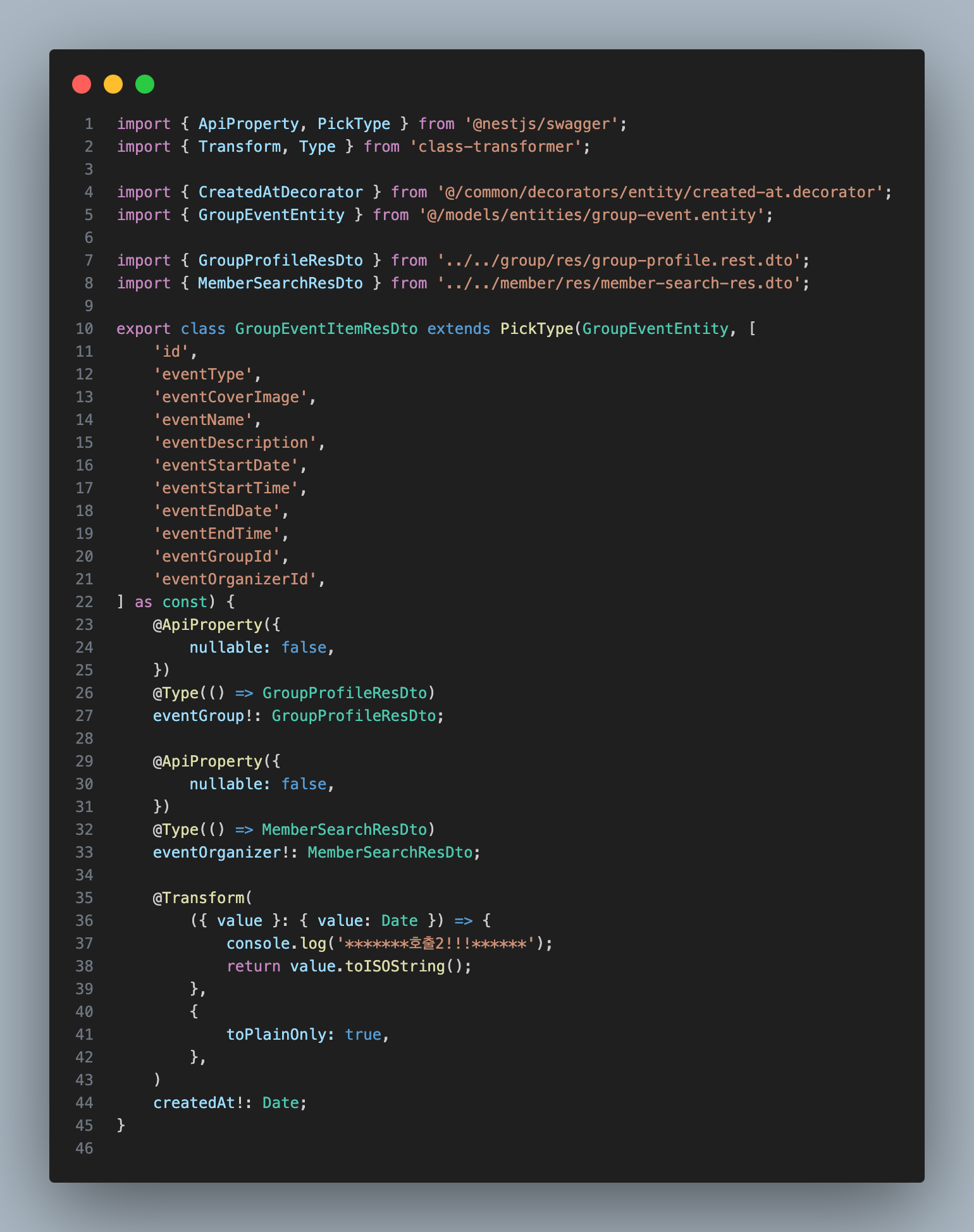 3. api를 마지막으로 return 하기 전에 @Transform 데코레이터를 이용하여 원하는 작업을 수행한다.해당 코드에서는 GroupEventItemResDto과 MemberSearchResDto에서 createdAt 프로퍼티를 리턴 하기 전에 @Transform 작업을 하기 때문에 호출2와 호출3이라는 console.log가 출력 되는지 테스트 해보면 정상적으로 나오는걸 알 수 있다.