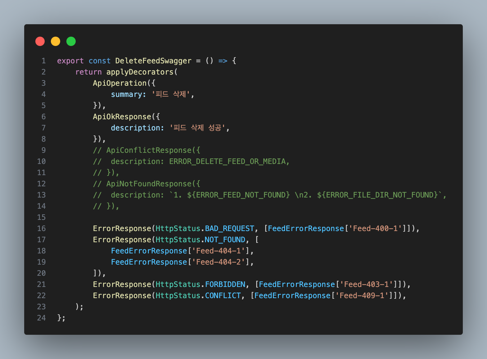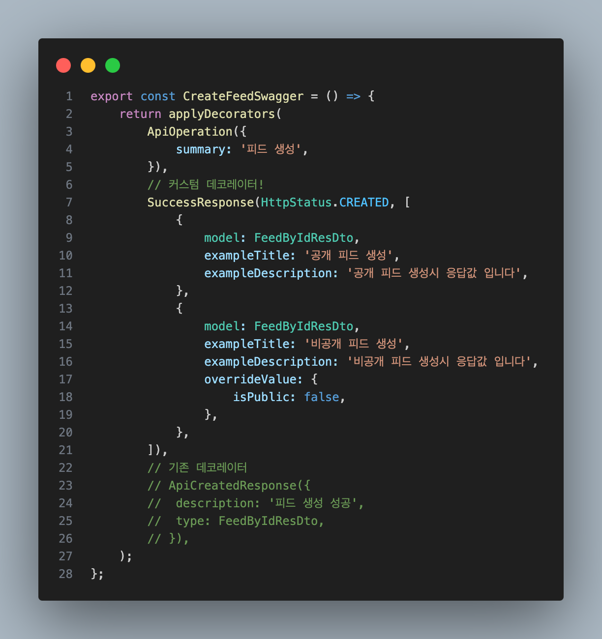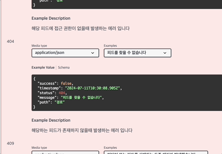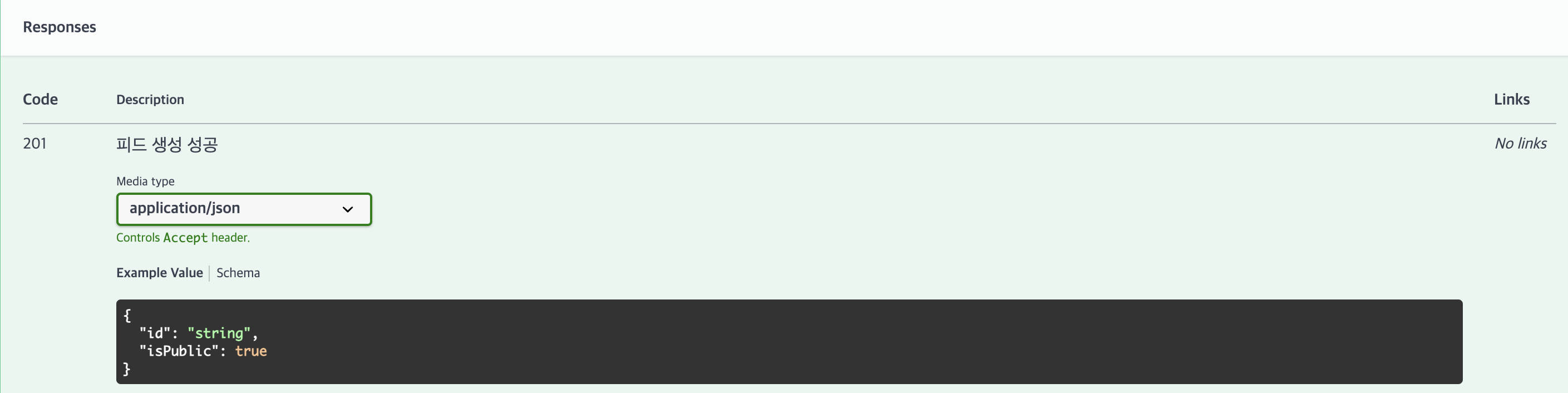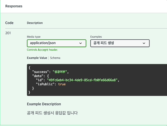 예를들어 피드 생성에 성공에 대한 response인데 해당 피드가 공개 피드 생성 했을때 response와 비공개 피드 생성시 response를 보다 구체적으로 swagger로 제공 해준다면 프론트 엔드 개발자 입장에서 swagger 문서에 대한 가독성이 굉장히 올라갈것이다.