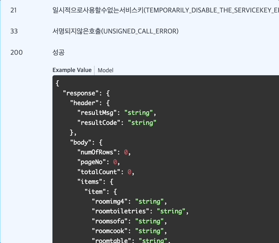내가 만약 해당 Swagger를 제공 받은 프론트엔드 개발자라면 이게 무엇인지 이해가 안되고 틈만 나면 백엔드 개발자에게 물어봐야 할것이다. 즉, Response dto schema를 참고하라고 보통 할텐데 숙박(32) : 테이블여부 이런식으로 프로퍼티가 열거형으로 되어 있고 해당 프로퍼티를 다 열어보면서 작업해야 되서 가독성이 굉장히 떨어진다.