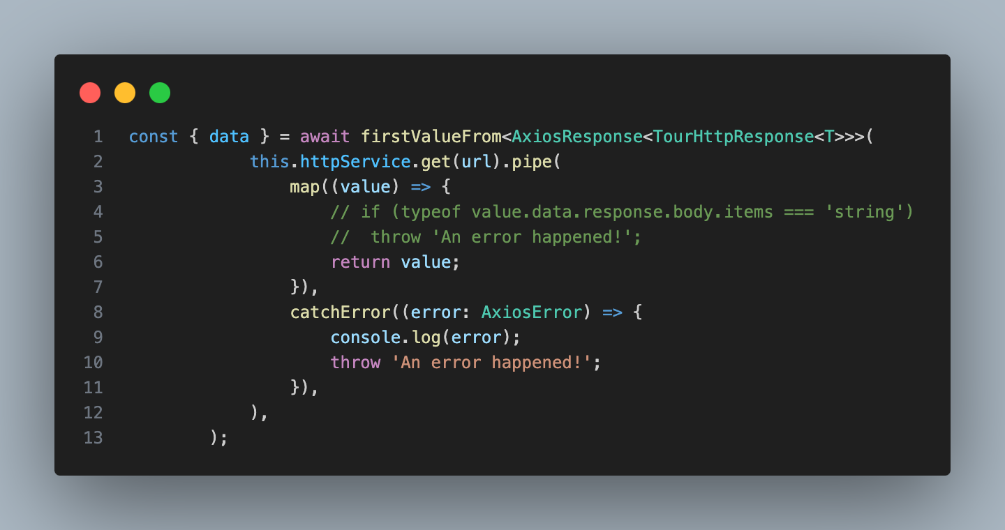 핸들링 가능한 모든 에러는 다 map으로 이동 된다. catchError는 http request error가 아닌 요청 자체를 못보내는 케이스나 그럴때나 핸들링 가능할것 같다. 예를들면 틀린 url에 요청을 보냈거나 했을때 즉 httpService에러일때나 catchError를 사용될것이다.