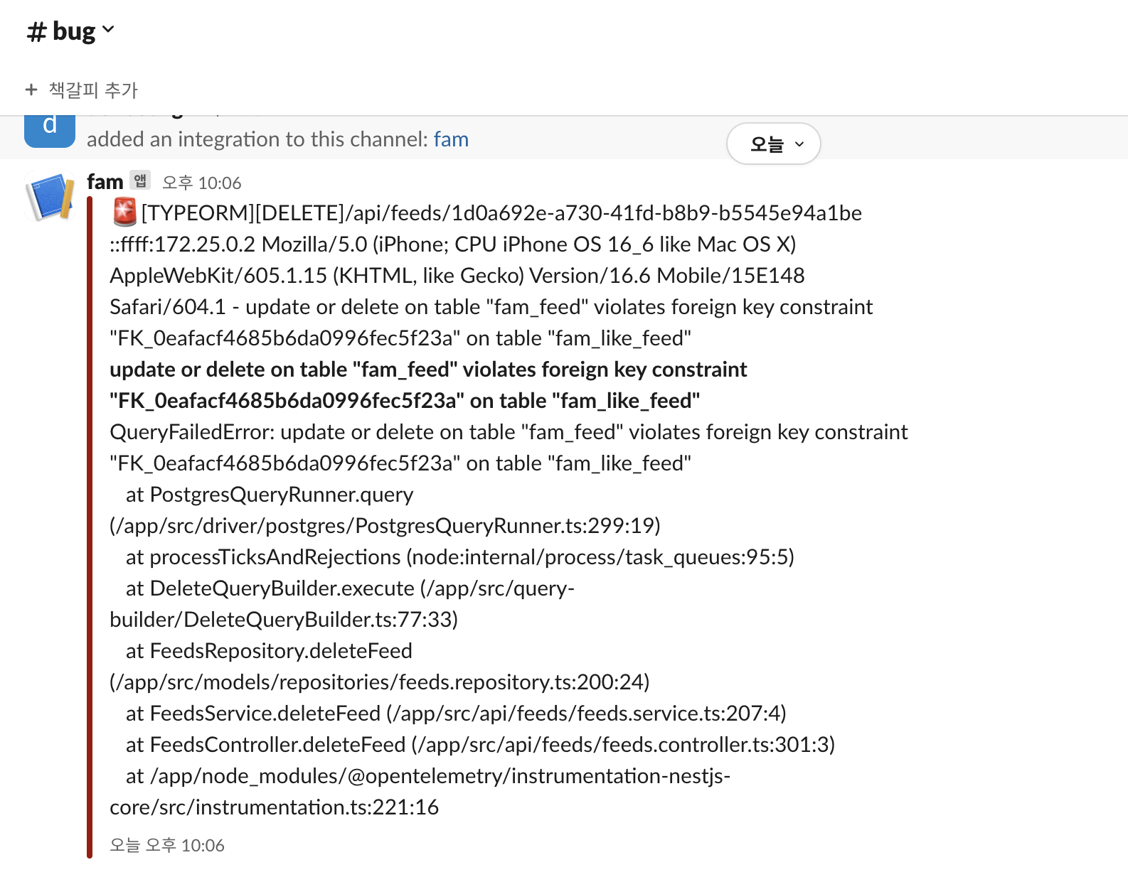 피드 삭제시 TypeORM 에러가 발생 했을때 slack