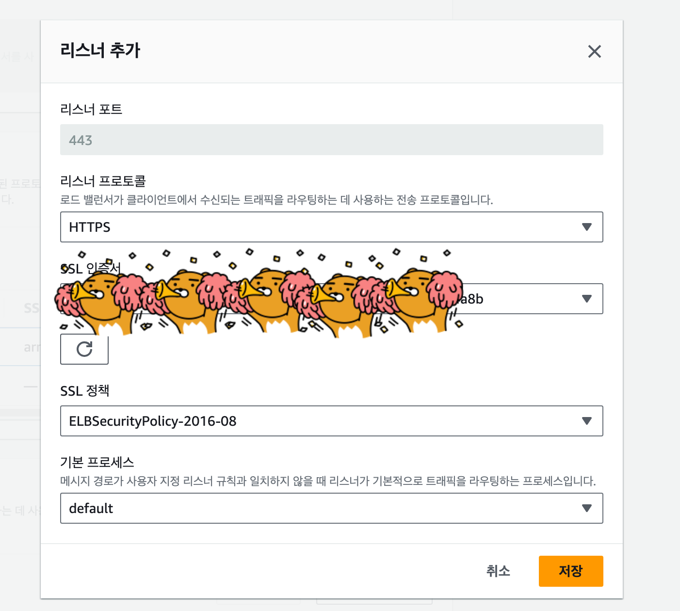 - 그래서 ACM 인증서는 Elastic Load Balancer와 위에서 연결 해주었기 때문에 해당 로드 밸런서에 443포트 리스너를 추가 해준것.