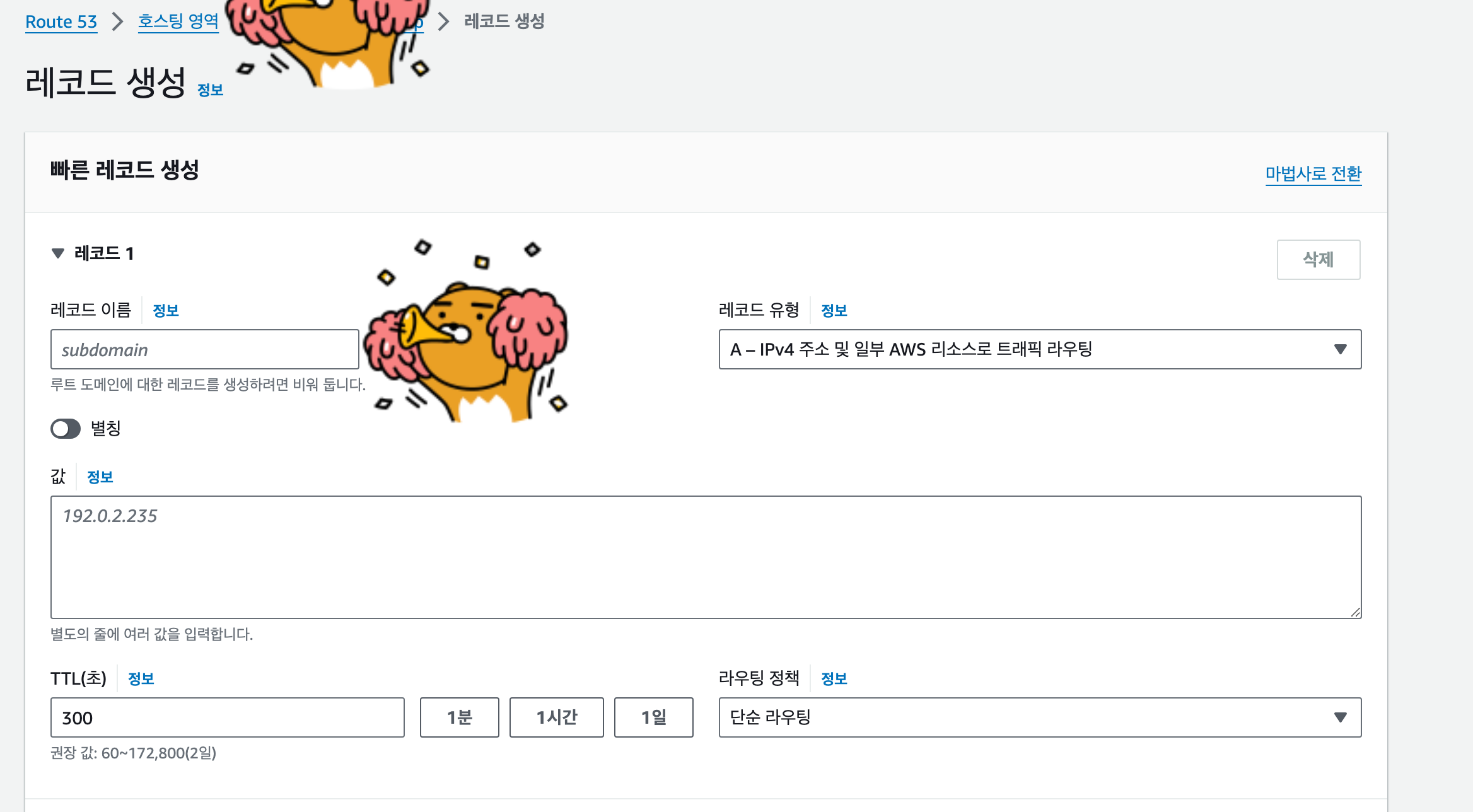 그다음 Route53으로 이동하여 레코드 생성 클릭