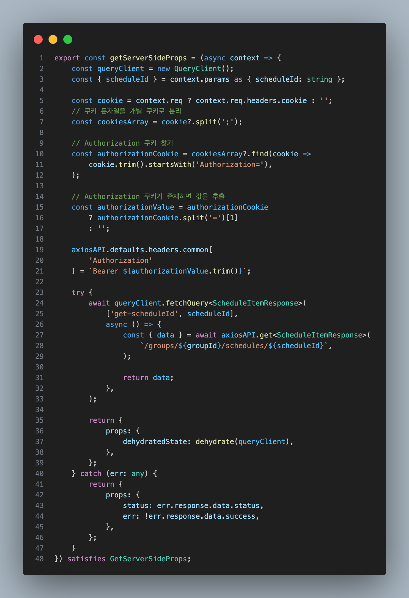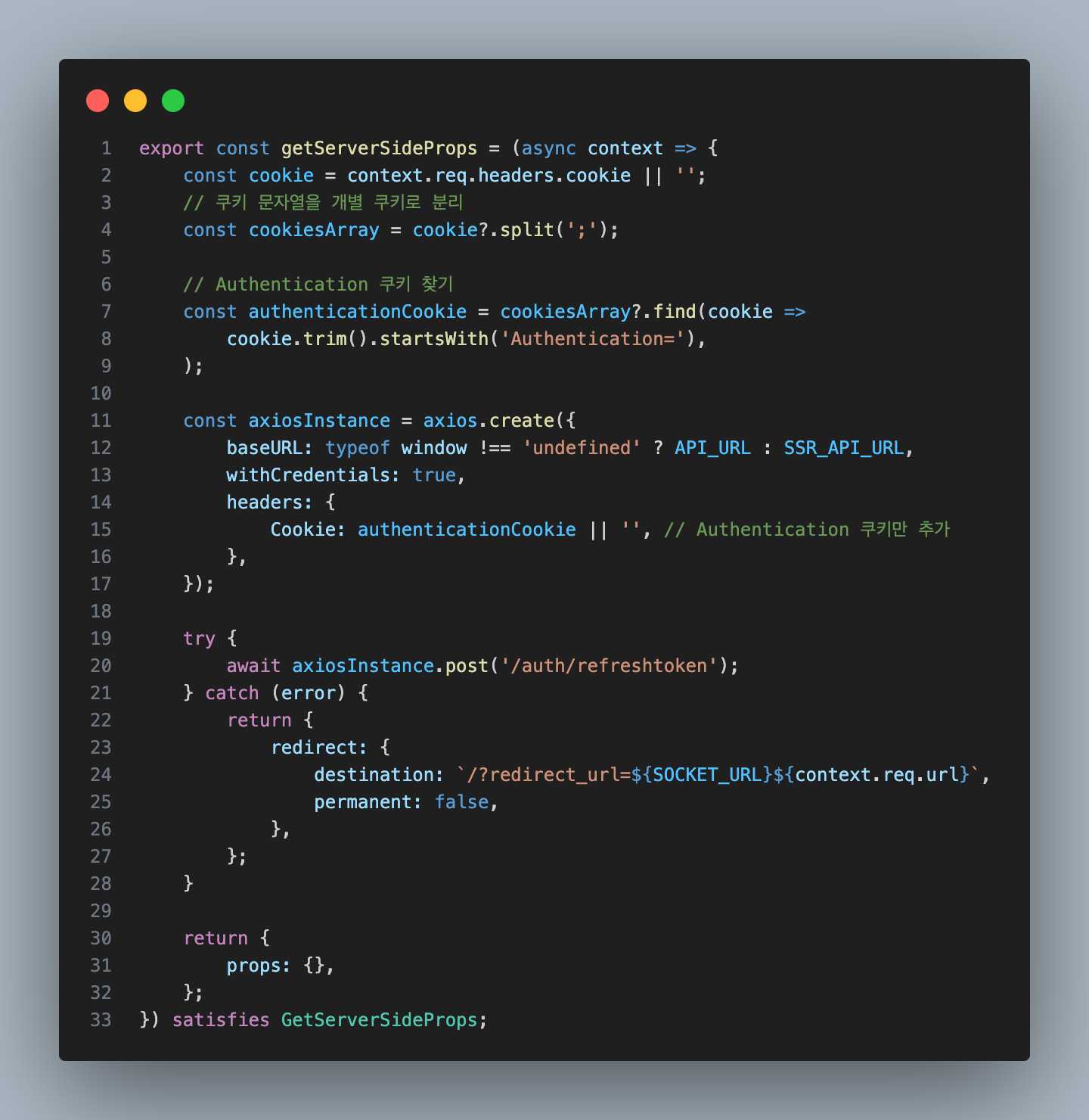 여기서 굉장히 불편한 상황이 발생하는데 바로 원하는 ssr에 사용될 로직을 사용하지도 않았는데 accessToken과 cookie를 넣어서 인증된 사용자인지 검증하는 로직을 ssr 사용되는 모든 페이지에 사용 되야 하는 번거로움이 따르고 아주 많은 중복 코드가 발생한다.