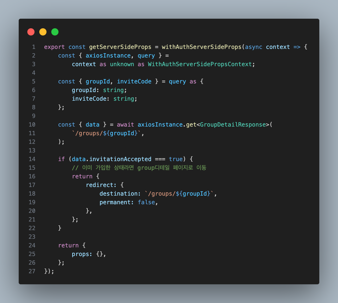 이미 해당 그룹에 가입자라면 그룹 디테일 페이지로 이동시키는 ssr 로직을 가독성있게 넣어줄 수 있게 되었다.