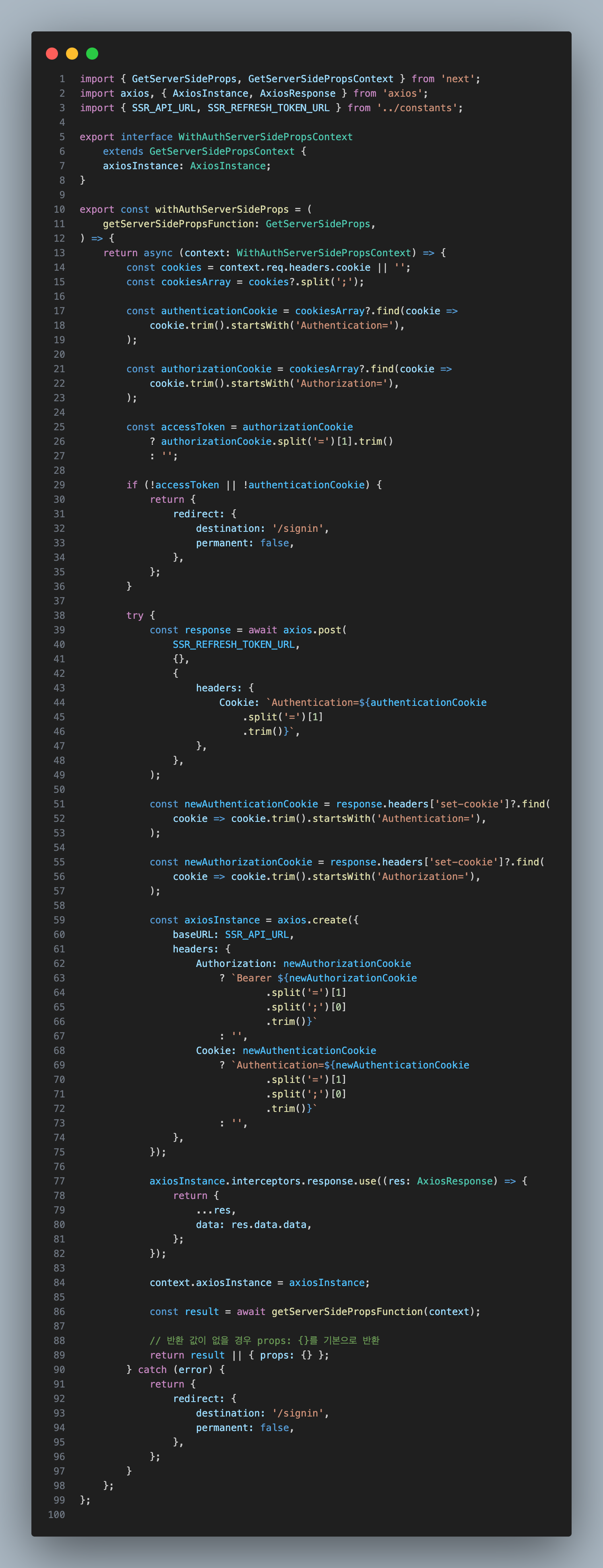 로그인 상태일경우 acceeToken을 header Bearer 토큰에 넣어주고 refreshToken을 cookie에 넣어준 상태의 axios 인스턴스를 반환해주고 로그인 상태가 아닐경우 로그인 페이지로 이동시키는 고차함수