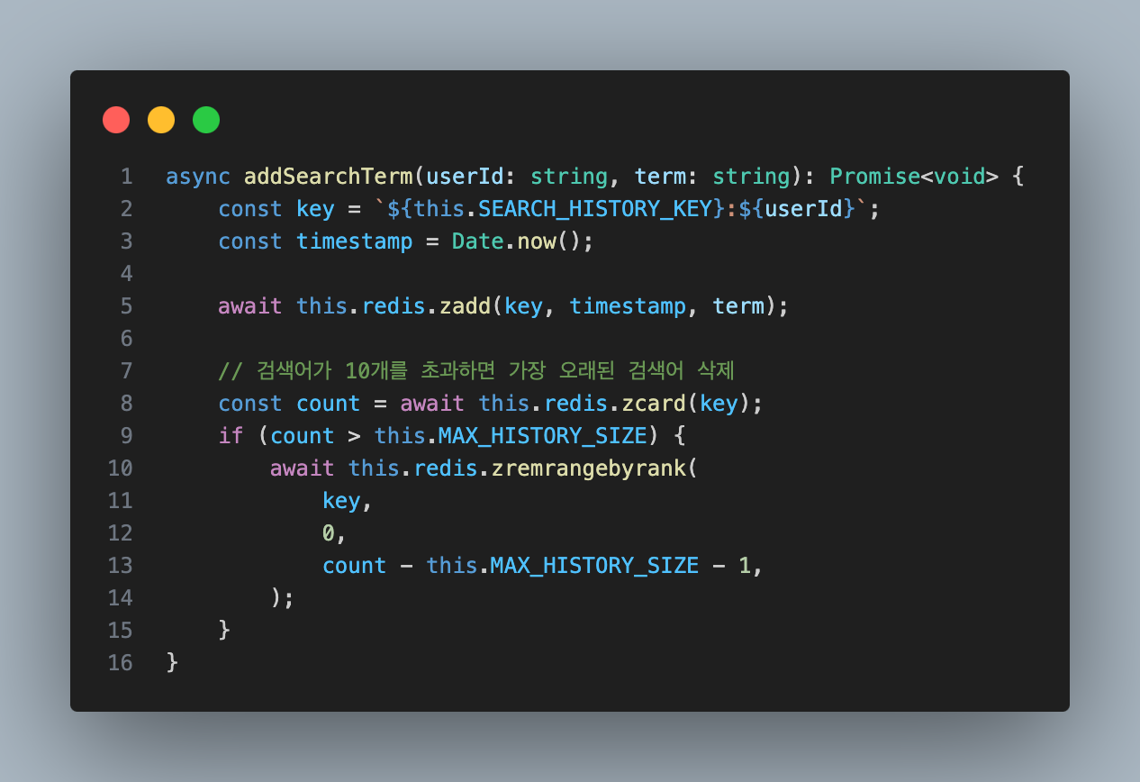 - 해당 갯수가 10개가 넘어 간다면 zremrangebyrank 메서드를 활용하여 제일 오래된 검색어를 삭제 한다