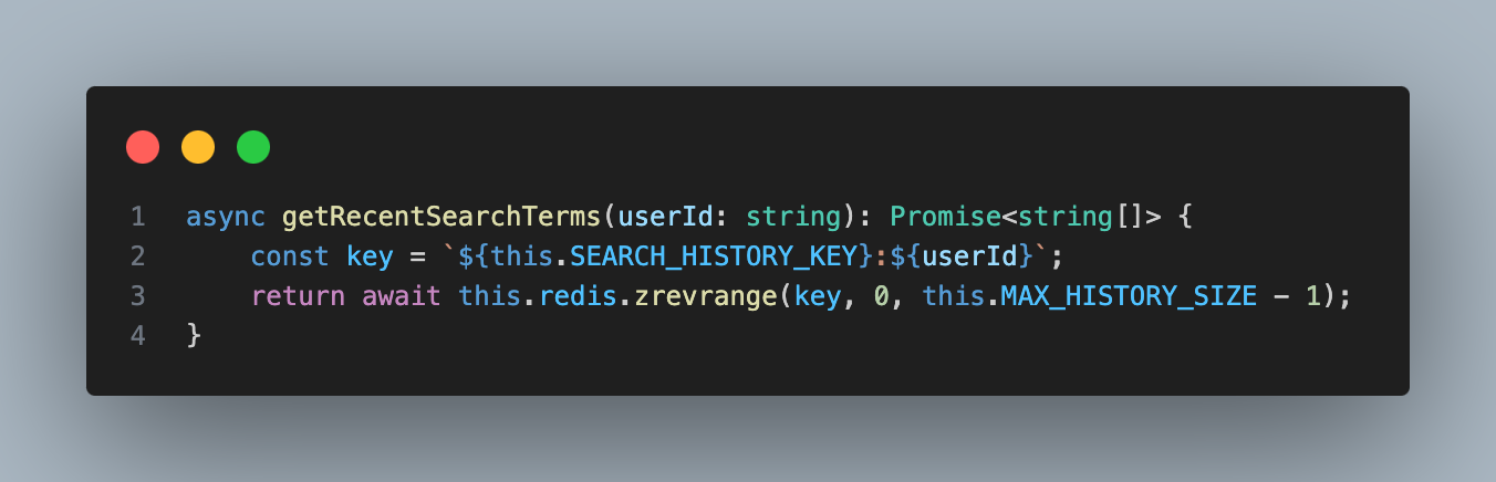 - zrevrange 메서드를 사용하여 key값에 해당하는 최근 검색어 10개만 가져온다.