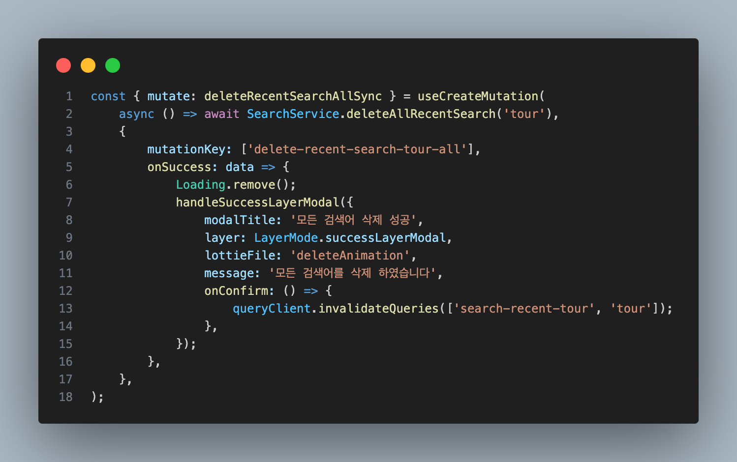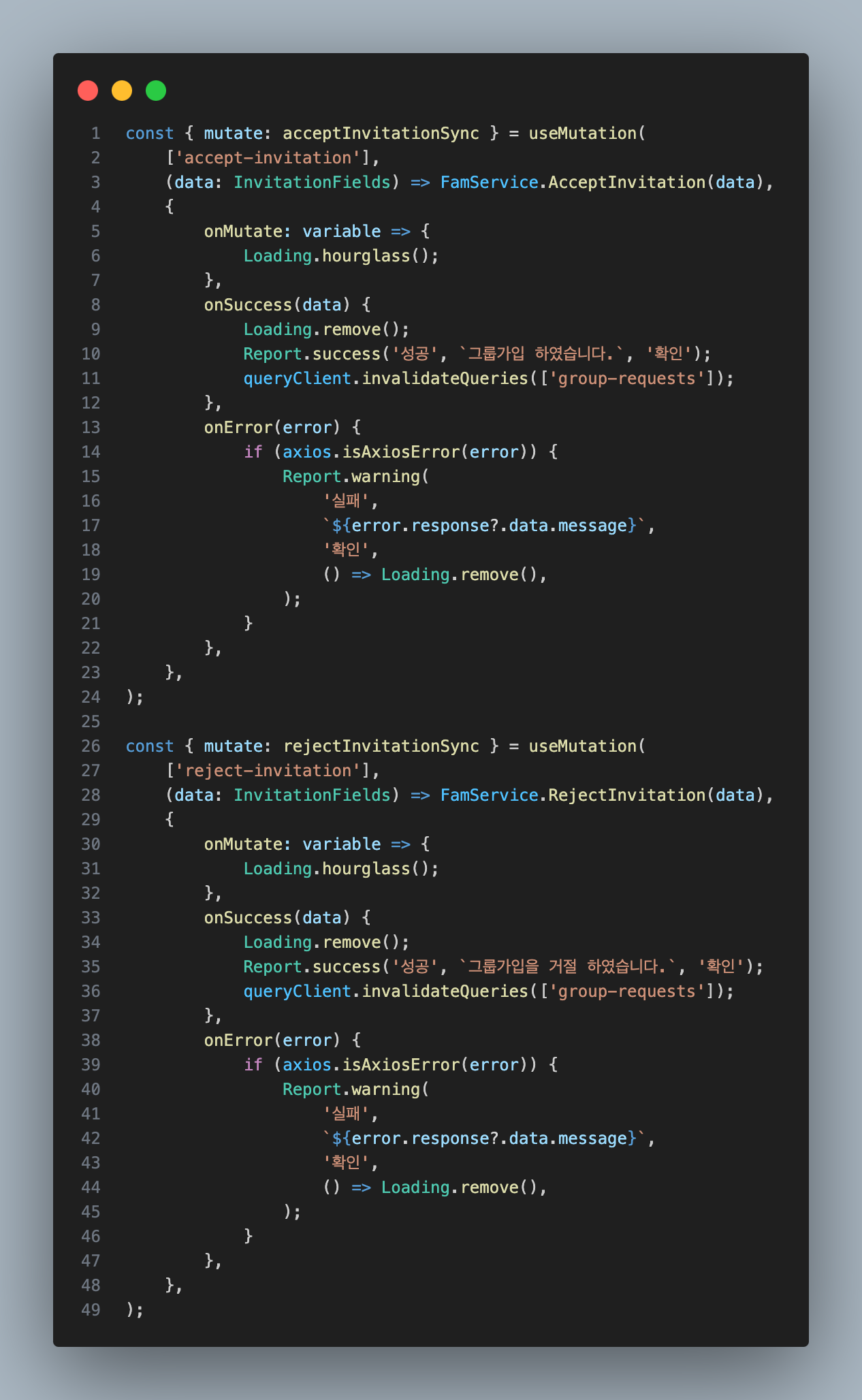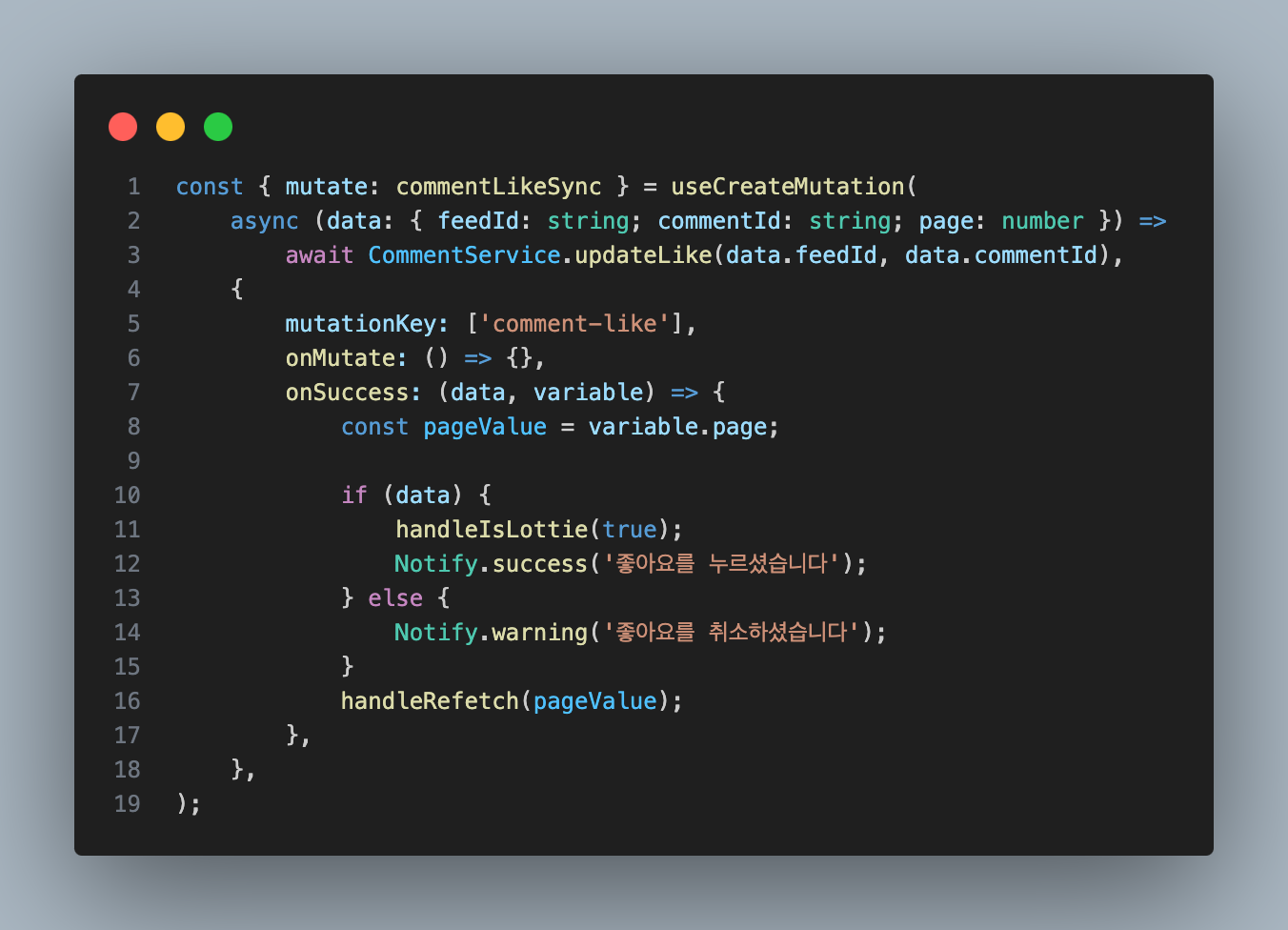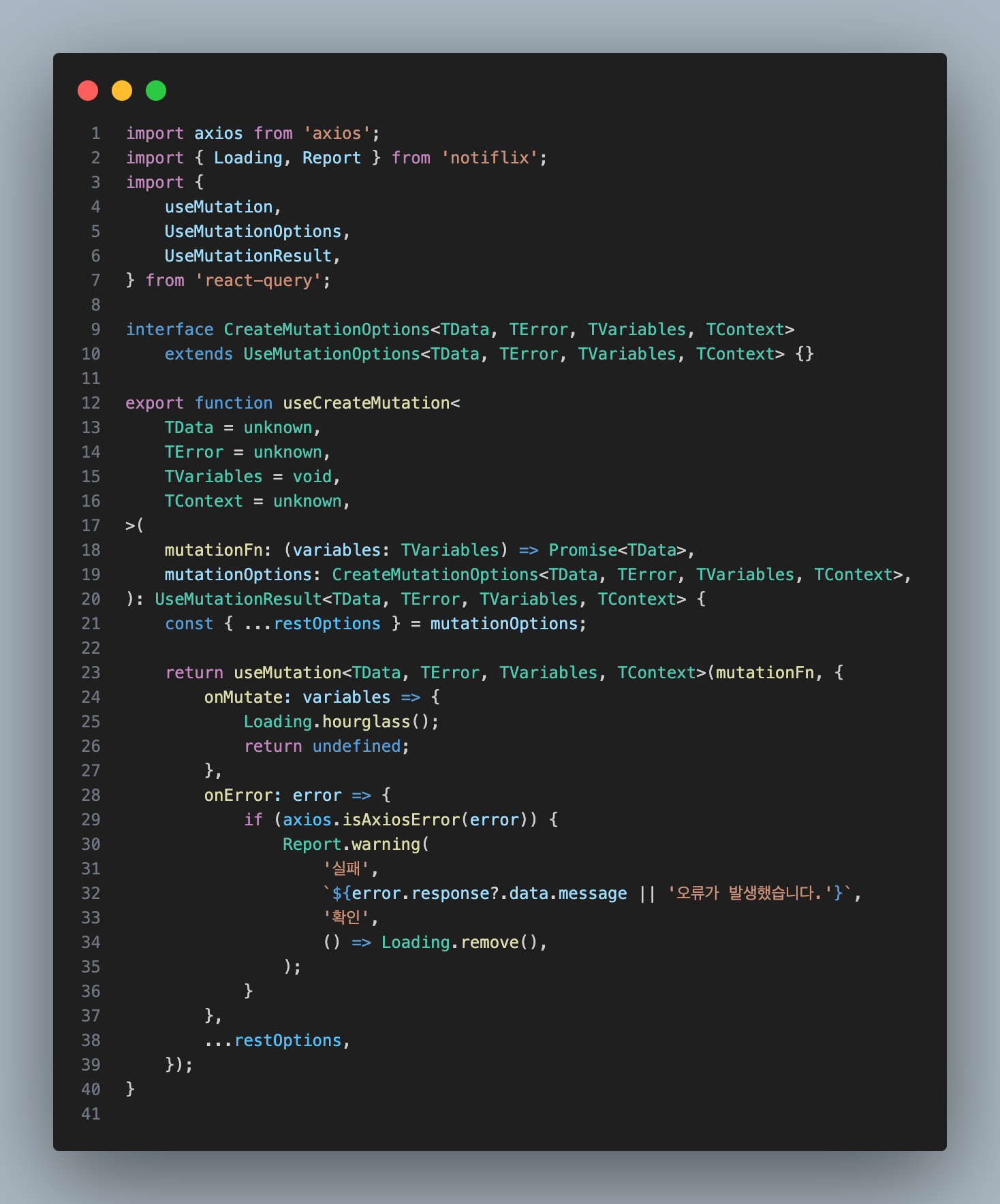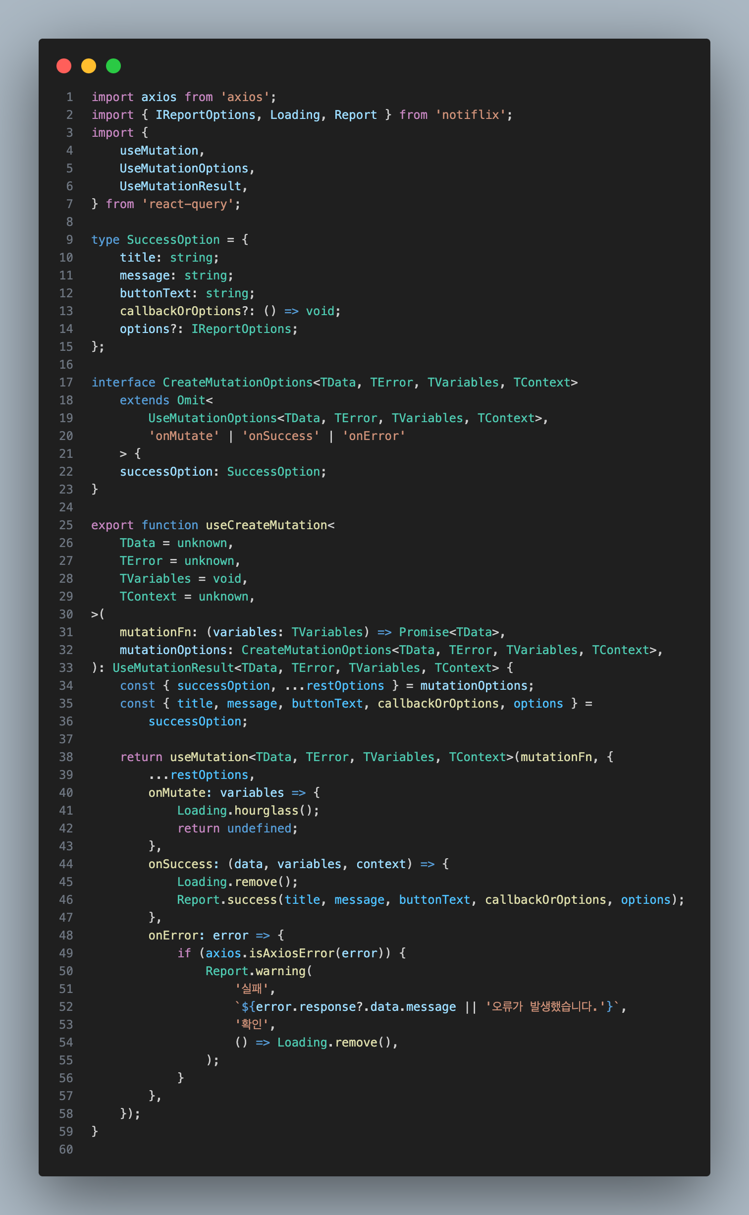 - 범용성이 좋은 코드를 만들기 위해 공통적으로 자주 호출되는 onMutate와 onError만 두고 onSuccess부분은 호출 부분에서 사용.