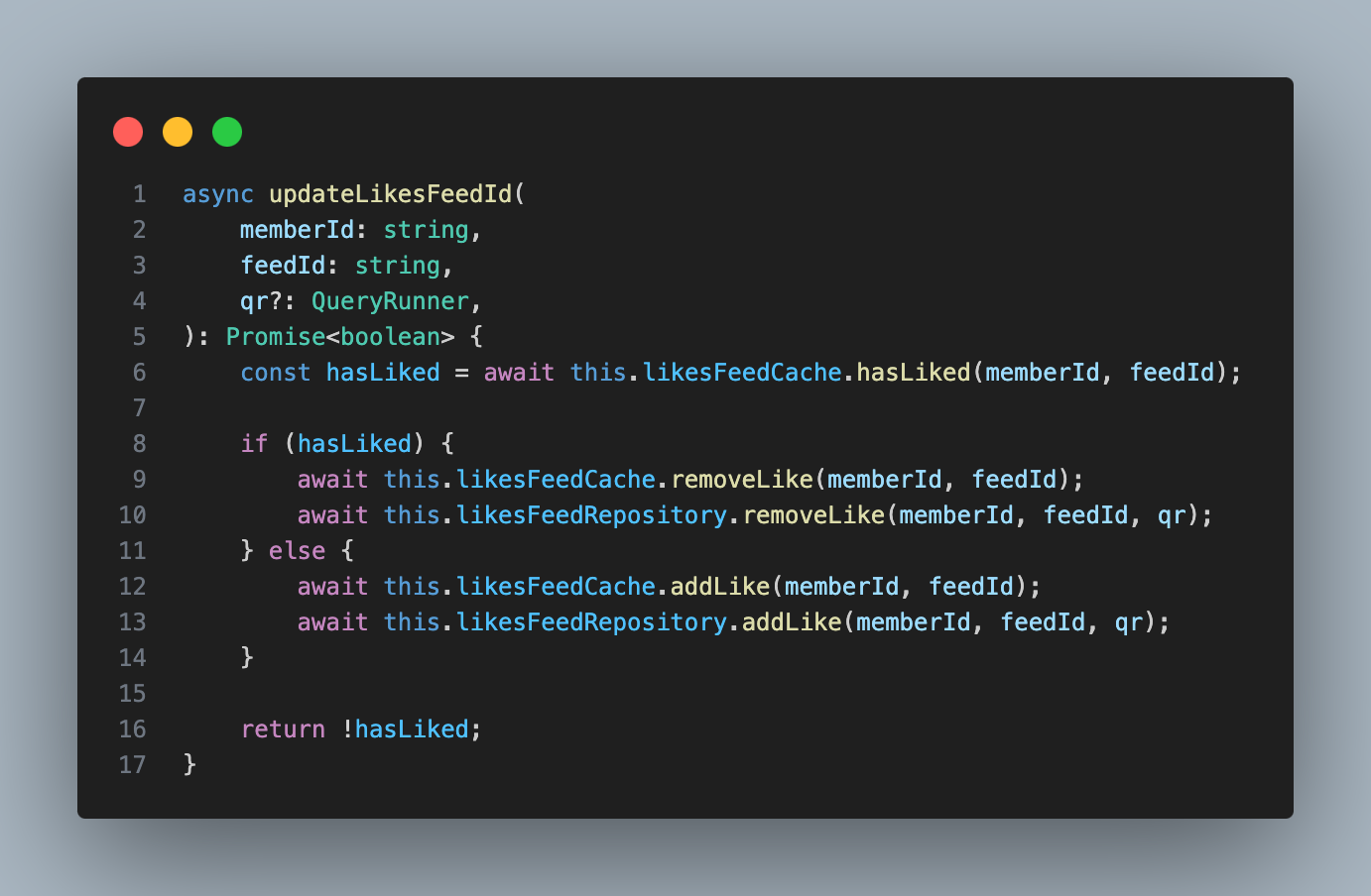 updateLikesFeedId 메서드의 코드를 살펴보면 좋아요를 removeLike나 addLike 할 때 에러가 발생하면 qr: QueryRunner를 통해서 롤백 해주는데 Redis에서는 없기 때문에 이렇게 되면 캐시 데이터와 RDBMS 데이터가 일치하지 않는 문제가 발생한다.