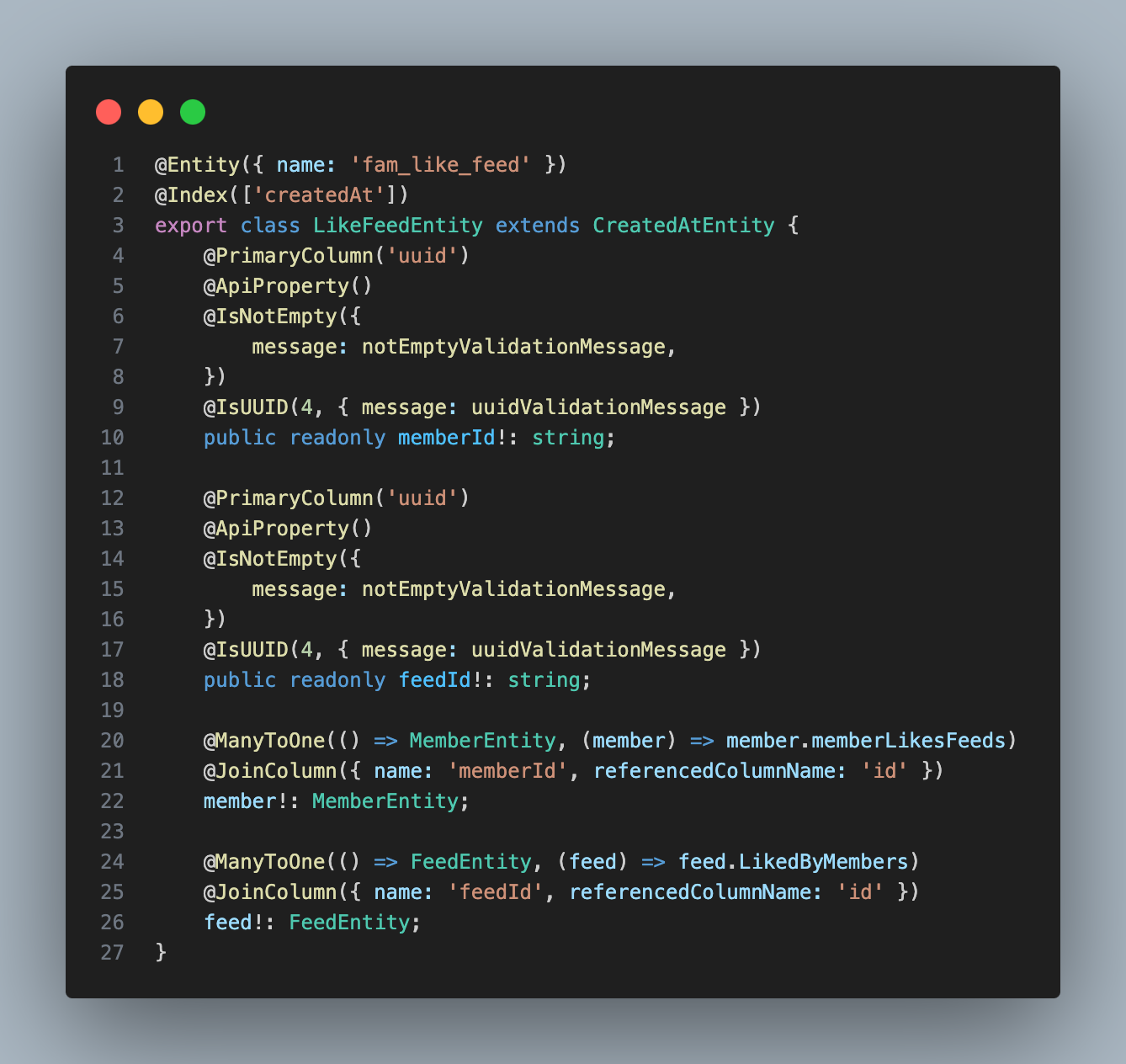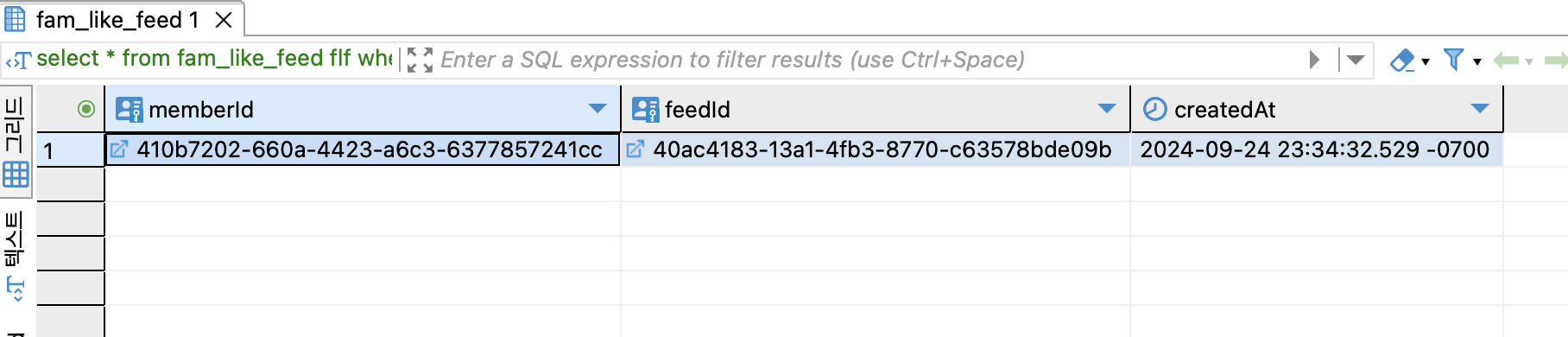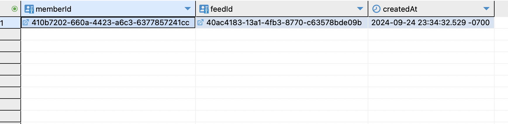 memberId와 feedId가 식별자 관계로 중복 데이터가 존재하지 않게 무결성을 보장 하지만 잦은 insert와 update는 성능 저하를 일으킨다.