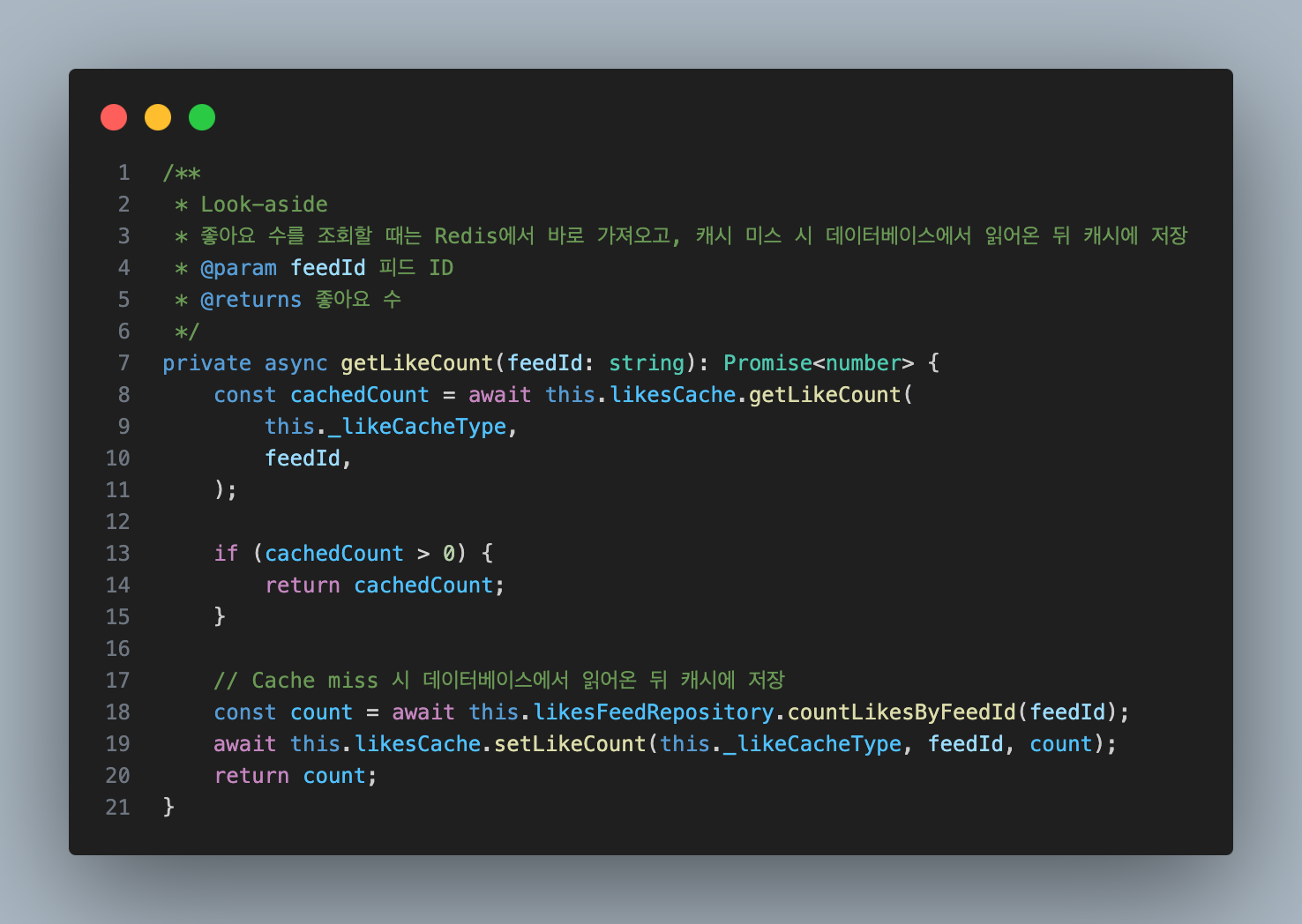 - 좋아요 수를 조회할 때는 Redis에서 바로 가져오고, 캐시 미스 시 데이터베이스에서 읽어온 뒤 캐시에 저장 (읽기 작업: Look-aside).