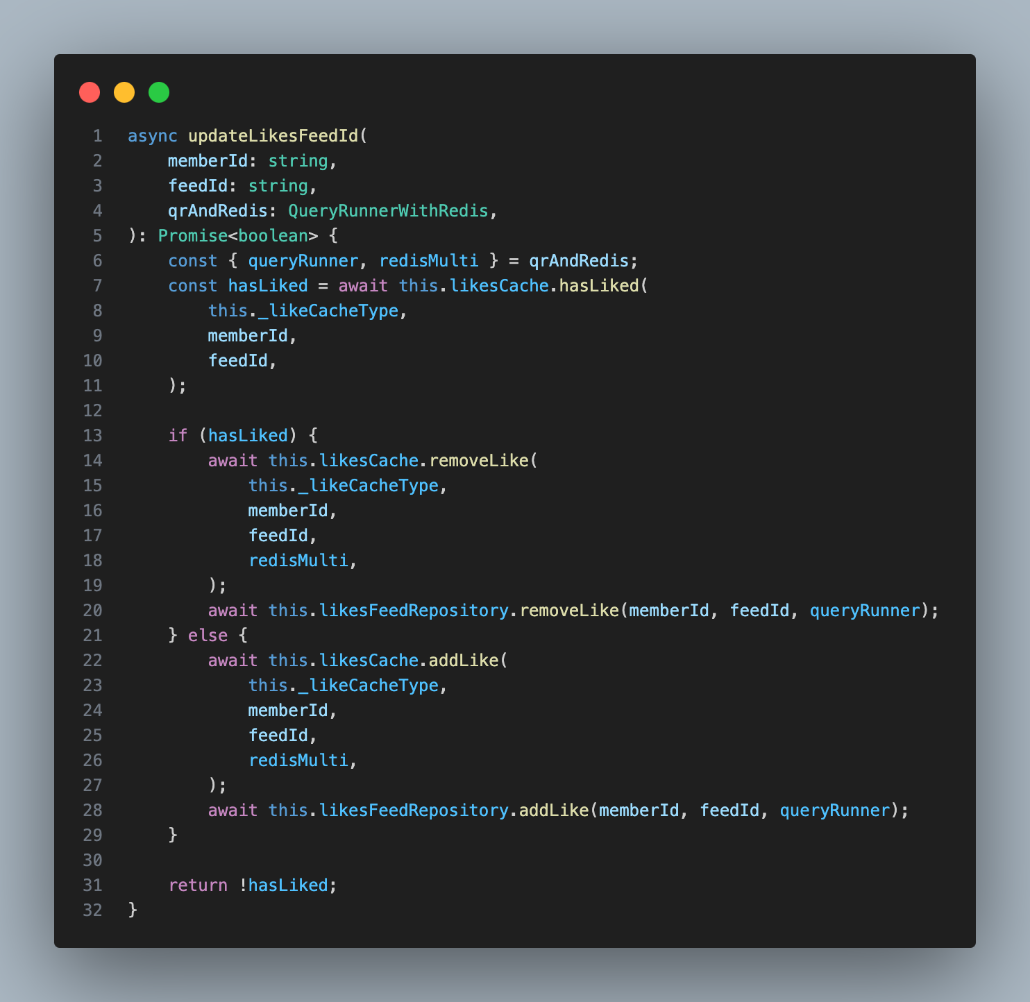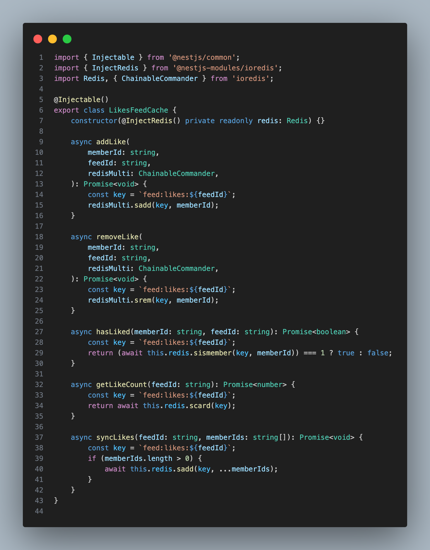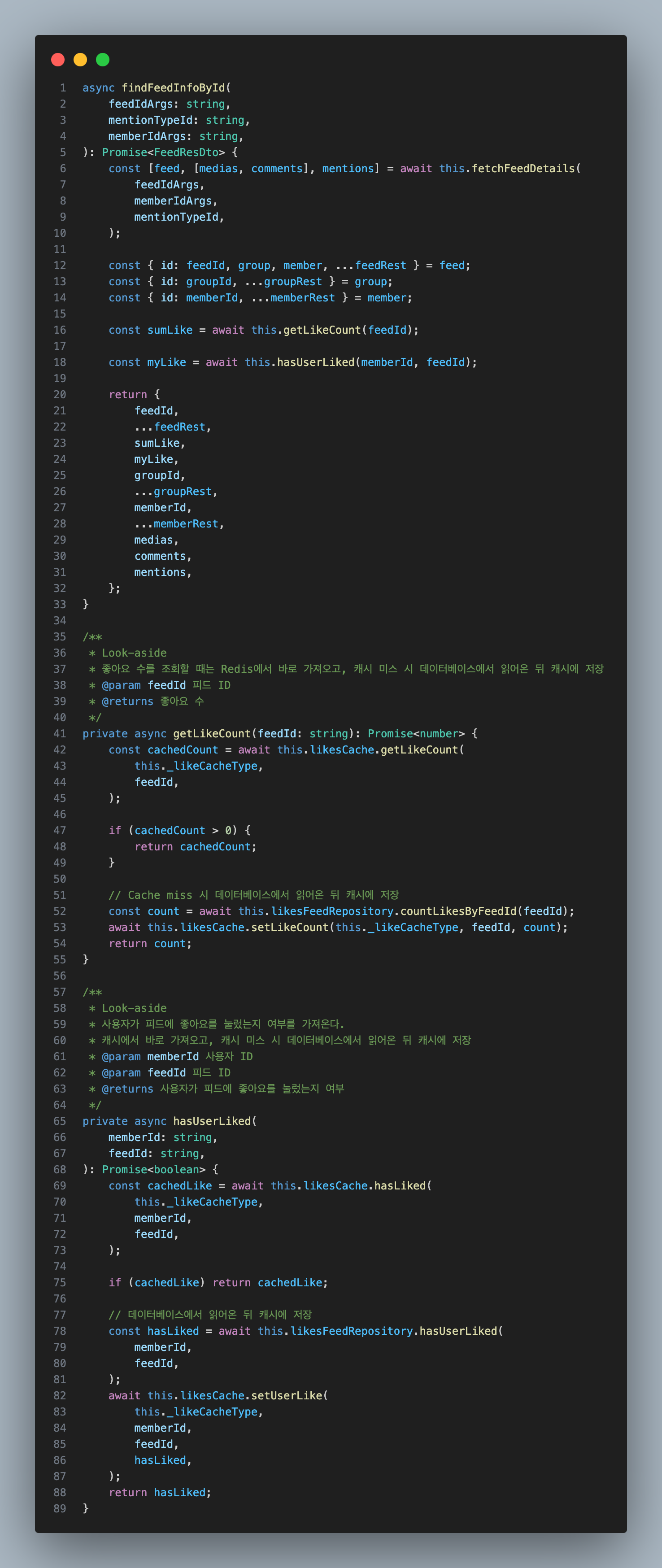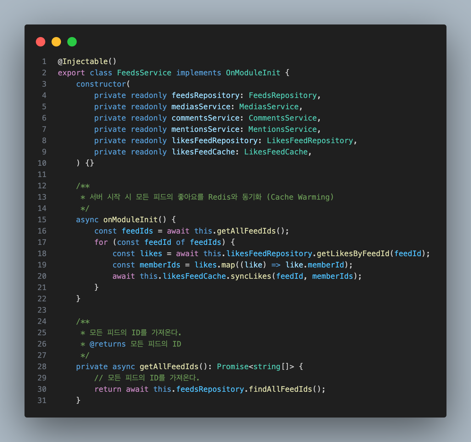 이를 방지하기 위해 서버가 시작될 때 미리 Redis에 필요한 데이터를 로드(Cache Warming) 해서 처음부터 캐시가 준비된 상태에서 빠른 응답을 제공 할 수 있게 된다.feeds.service.ts - updateLikesFeeId
