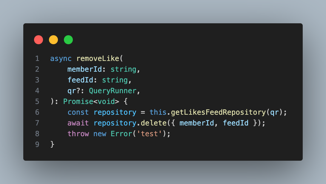 haLiked 좋아요가 존재 할 때 취소하는것이기 때문에 removeLike에서 에러가 발생하게 된다면 롤백이 되어야 한다.